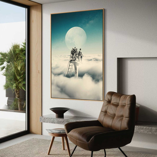 Unsere Kollektion moderner surrealer Wandkunst lädt dich dazu ein, in den Raum zu blicken, in dem die Realität sanft verschwimmt und Träume jeden Winkel zart färben.