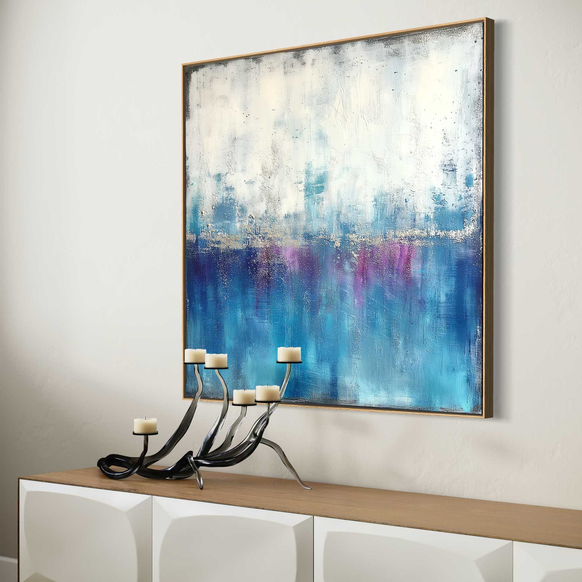 leading art fairs: in a wooden gallery frame with a shadow gap. There is a 10 mm wide shadow gap between your acrylic glass artwork with aluminum carrier plate and the frame strip - this makes the artwork appear to float in the wooden frame.