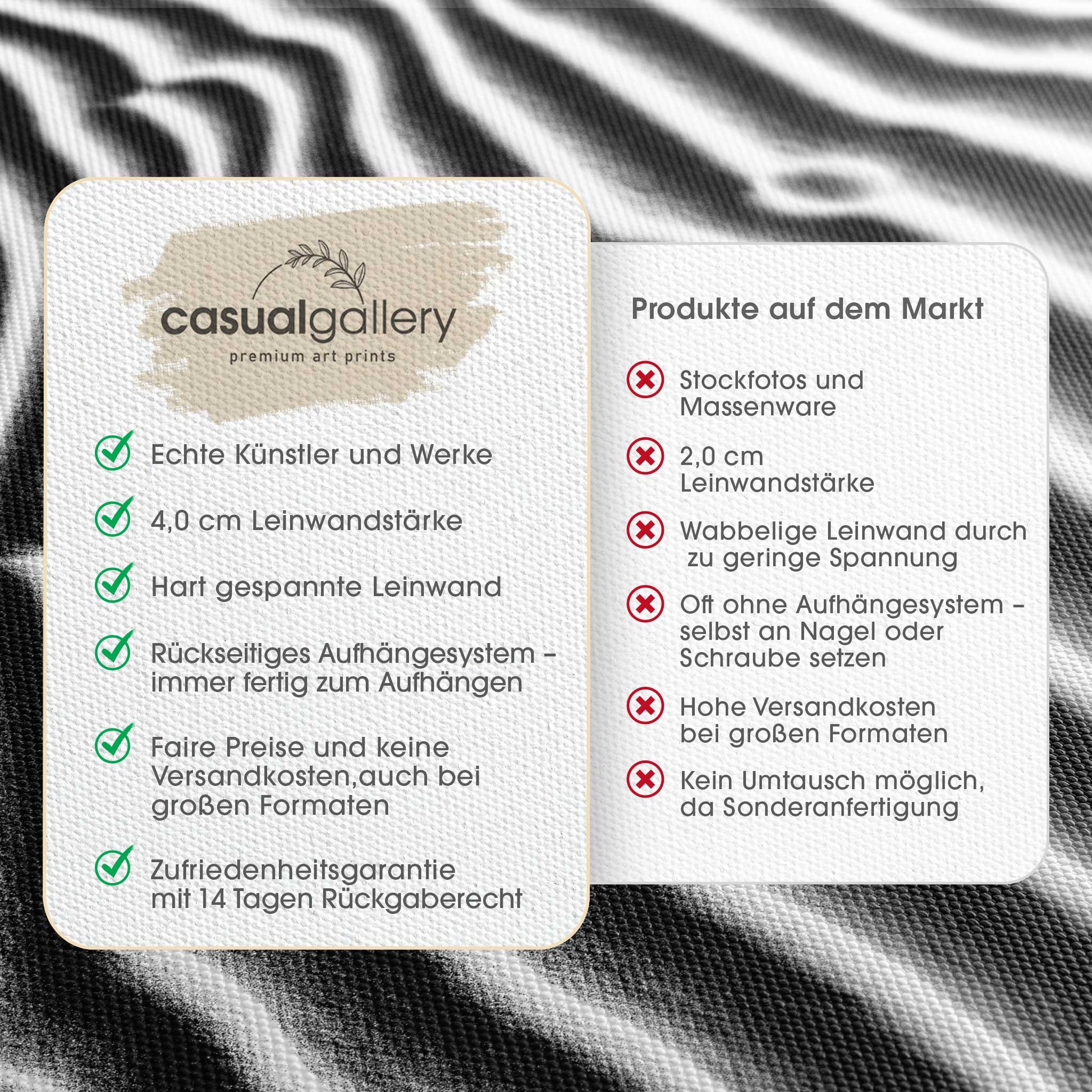 Der 4,0 cm starke Holzrahmen verleiht der Leinwand Tiefe und Stabilität. Jedes Bild wird sorgfältig aufgespannt, die Kanten sauber verarbeitet. Deine Leinwand kommt fix & fertig bei dir an – einfach auspacken, aufhängen und den neuen Look genießen.
