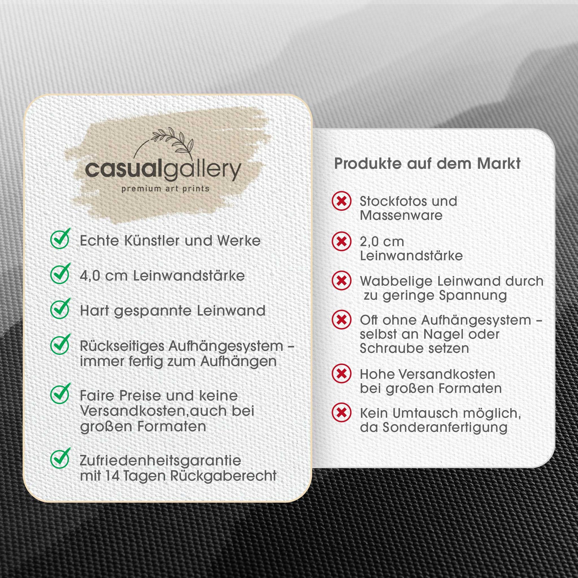 Wir hoffen, dass du mit deinem casualgallery Kunstwerk zufrieden bist. Wenn du ein anderes Produkt, eine andere Größe oder eine Rückerstattung wünscht, akzeptieren wir dennoch Umtausch und Rücksendungen innerhalb von 14 Tagen.