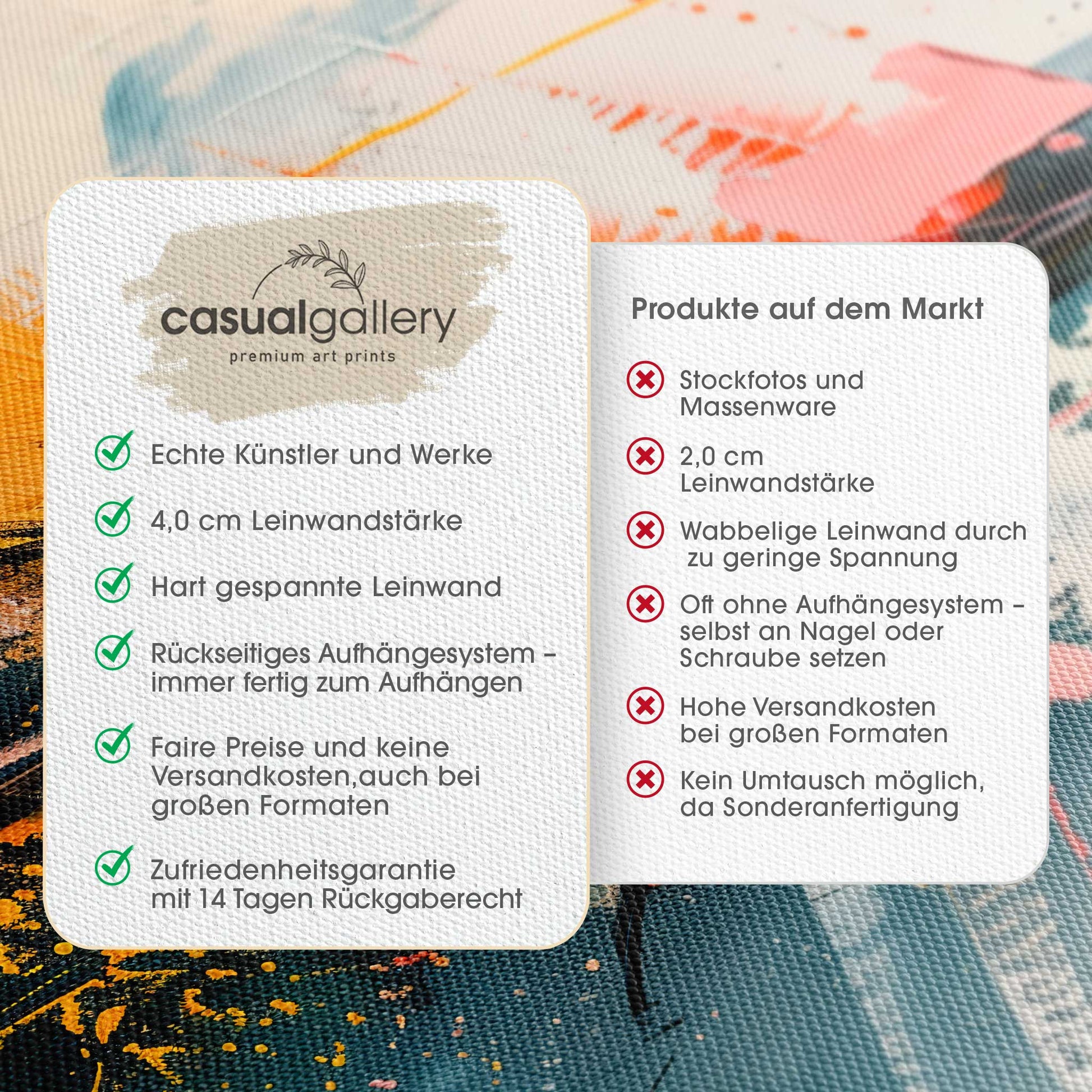 Der 4,0 cm starke Holzrahmen verleiht der Leinwand Tiefe und Stabilität. Jedes Bild wird sorgfältig aufgespannt, die Kanten sauber verarbeitet. Deine Leinwand kommt fix & fertig bei dir an – einfach auspacken, aufhängen und den neuen Look genießen.