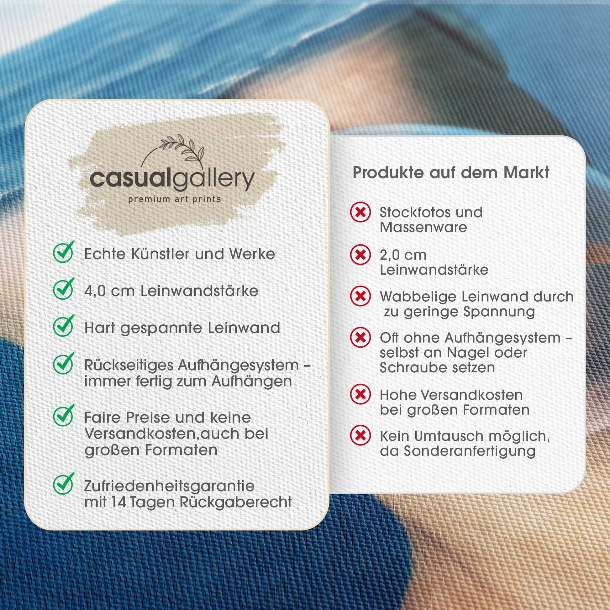 Wir hoffen, dass du mit deinem casualgallery Kunstwerk zufrieden bist. Wenn du ein anderes Produkt, eine andere Größe oder eine Rückerstattung wünscht, akzeptieren wir dennoch Umtausch und Rücksendungen innerhalb von 14 Tagen.