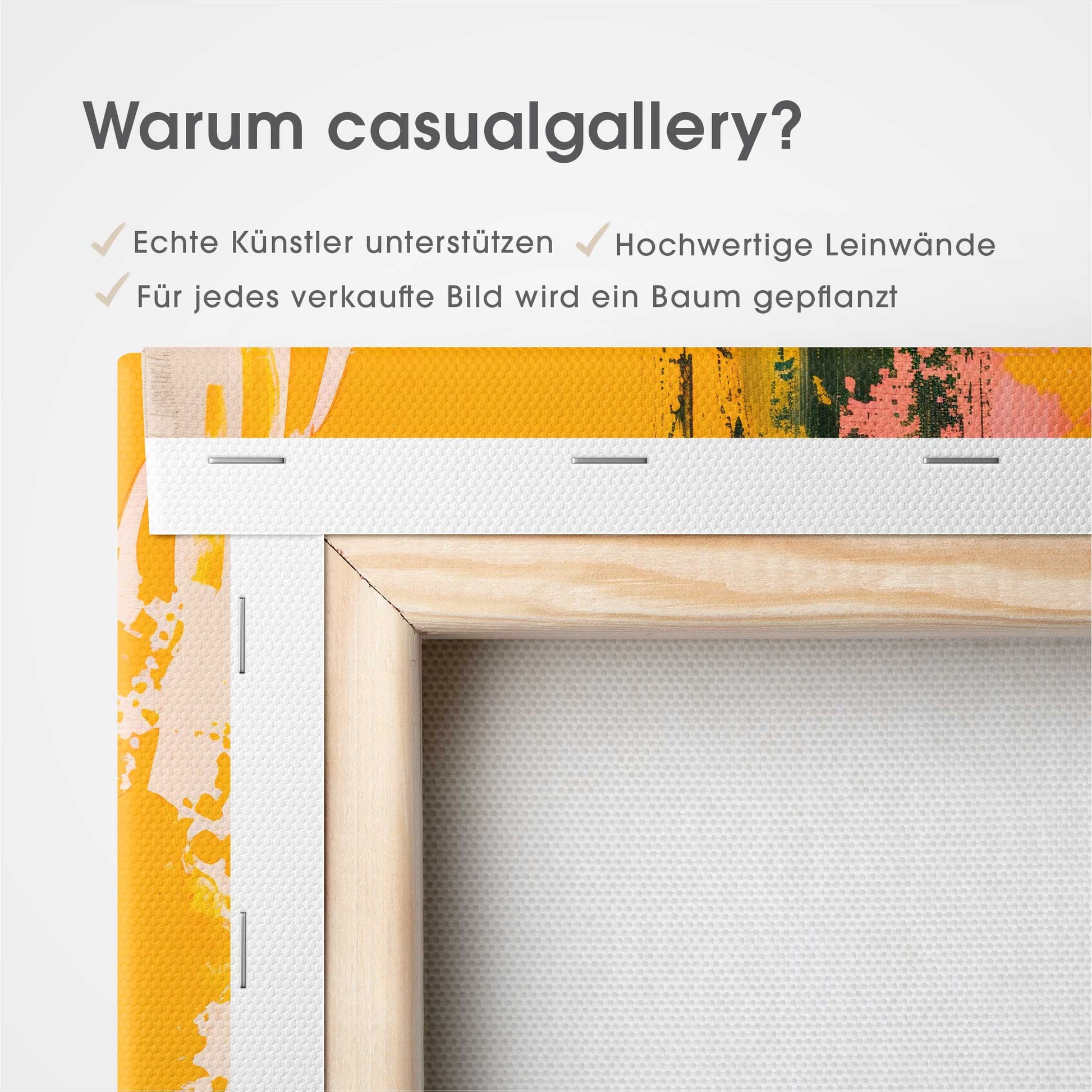 Der 4,0 cm starke Holzrahmen verleiht der Leinwand Tiefe und Stabilität. Jedes Bild wird sorgfältig aufgespannt, die Kanten sauber verarbeitet. Deine Leinwand kommt fix & fertig bei dir an – einfach auspacken, aufhängen und den neuen Look genießen.