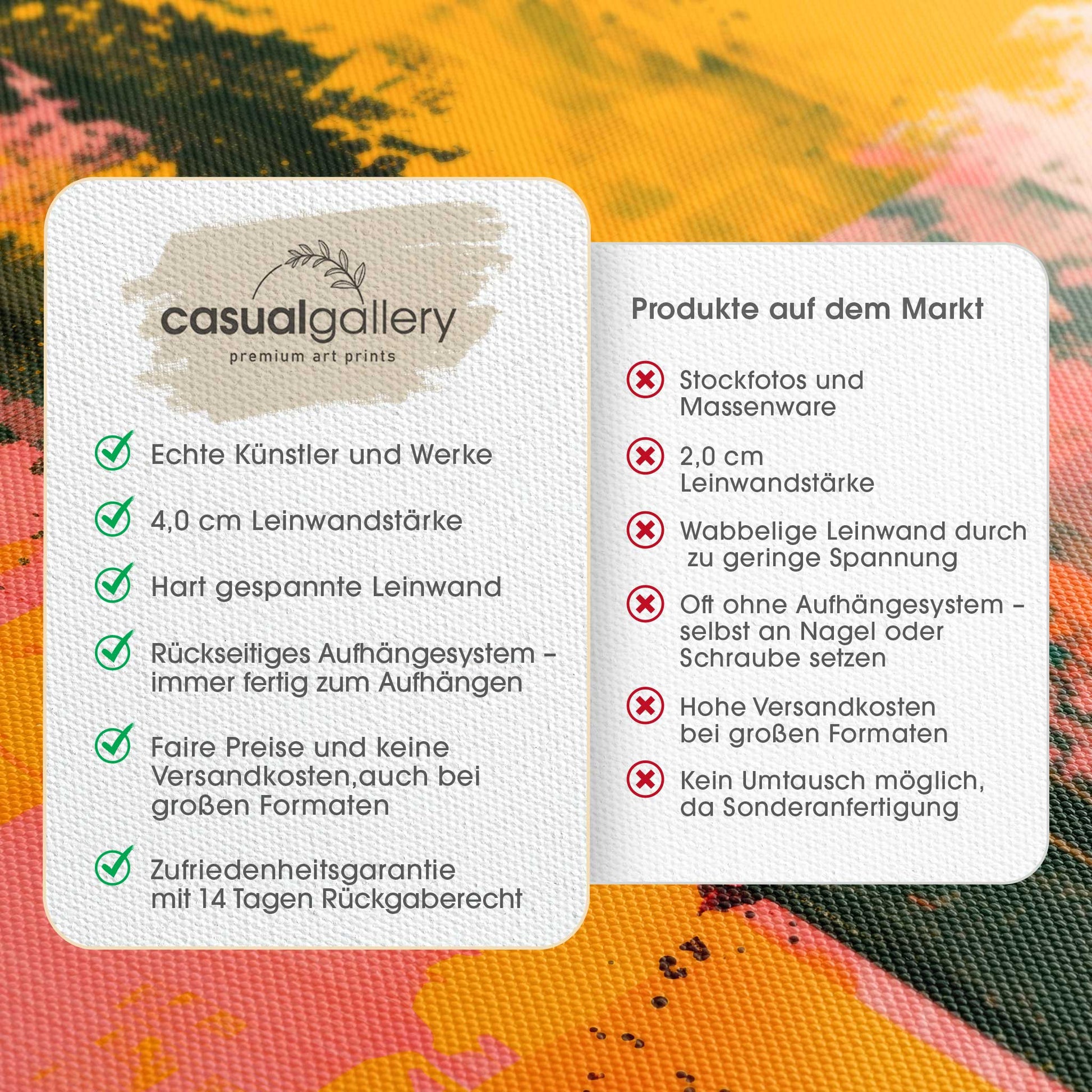 Wir hoffen, dass du mit deinem casualgallery Kunstwerk zufrieden bist. Wenn du ein anderes Produkt, eine andere Größe oder eine Rückerstattung wünscht, akzeptieren wir dennoch Umtausch und Rücksendungen innerhalb von 14 Tagen.