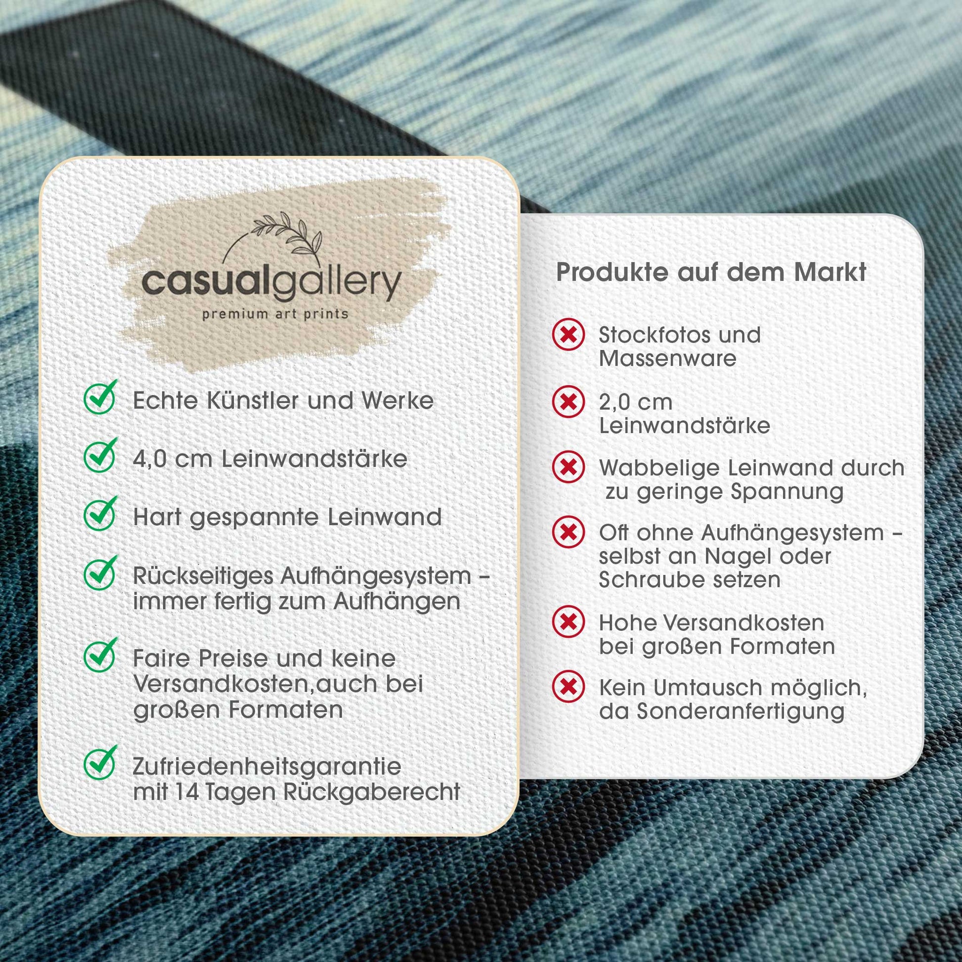 Wir hoffen, dass du mit deinem casualgallery Kunstwerk zufrieden bist. Wenn du ein anderes Produkt, eine andere Größe oder eine Rückerstattung wünscht, akzeptieren wir dennoch Umtausch und Rücksendungen innerhalb von 14 Tagen.