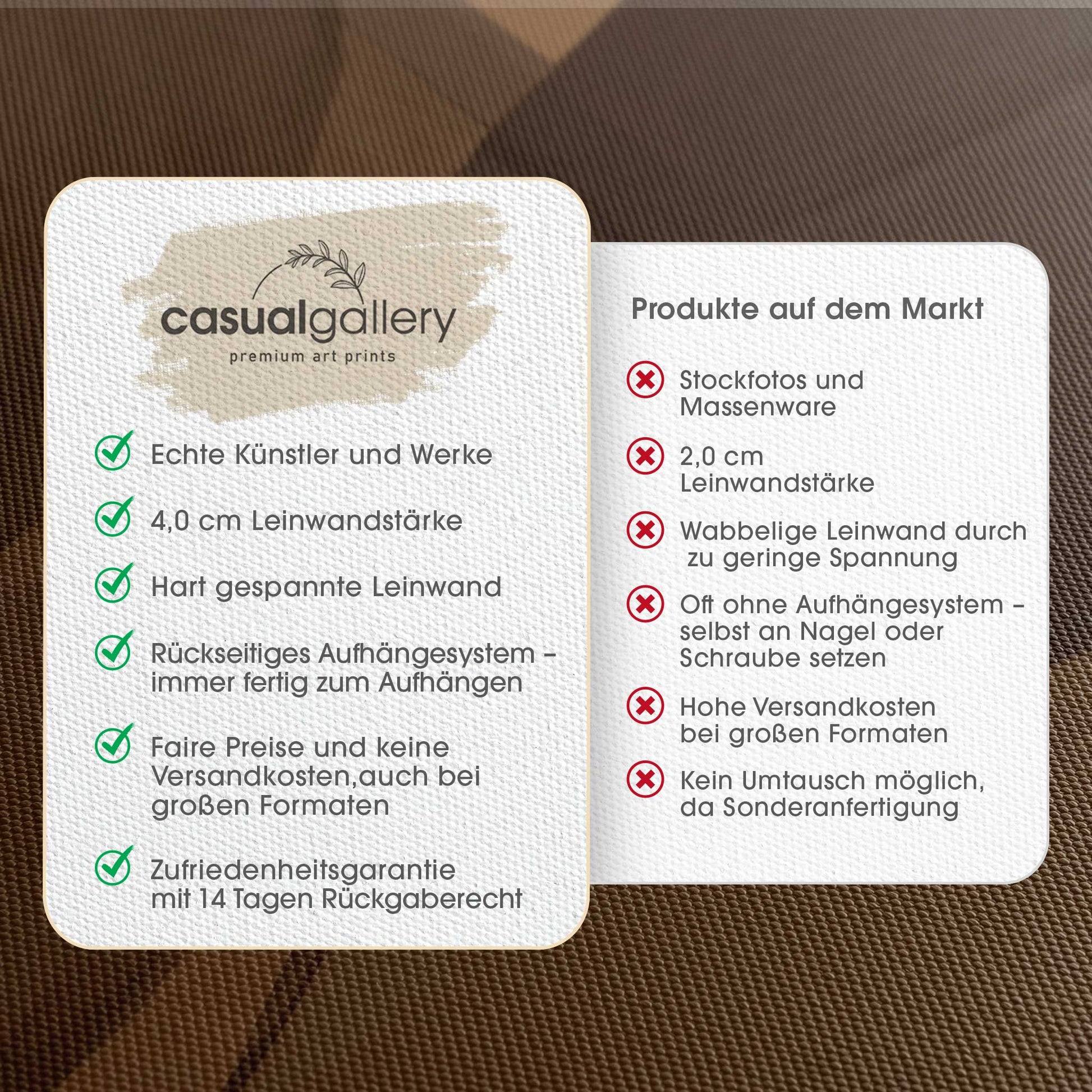 Wir hoffen, dass du mit deinem casualgallery Kunstwerk zufrieden bist. Wenn du ein anderes Produkt, eine andere Größe oder eine Rückerstattung wünscht, akzeptieren wir dennoch Umtausch und Rücksendungen innerhalb von 14 Tagen.