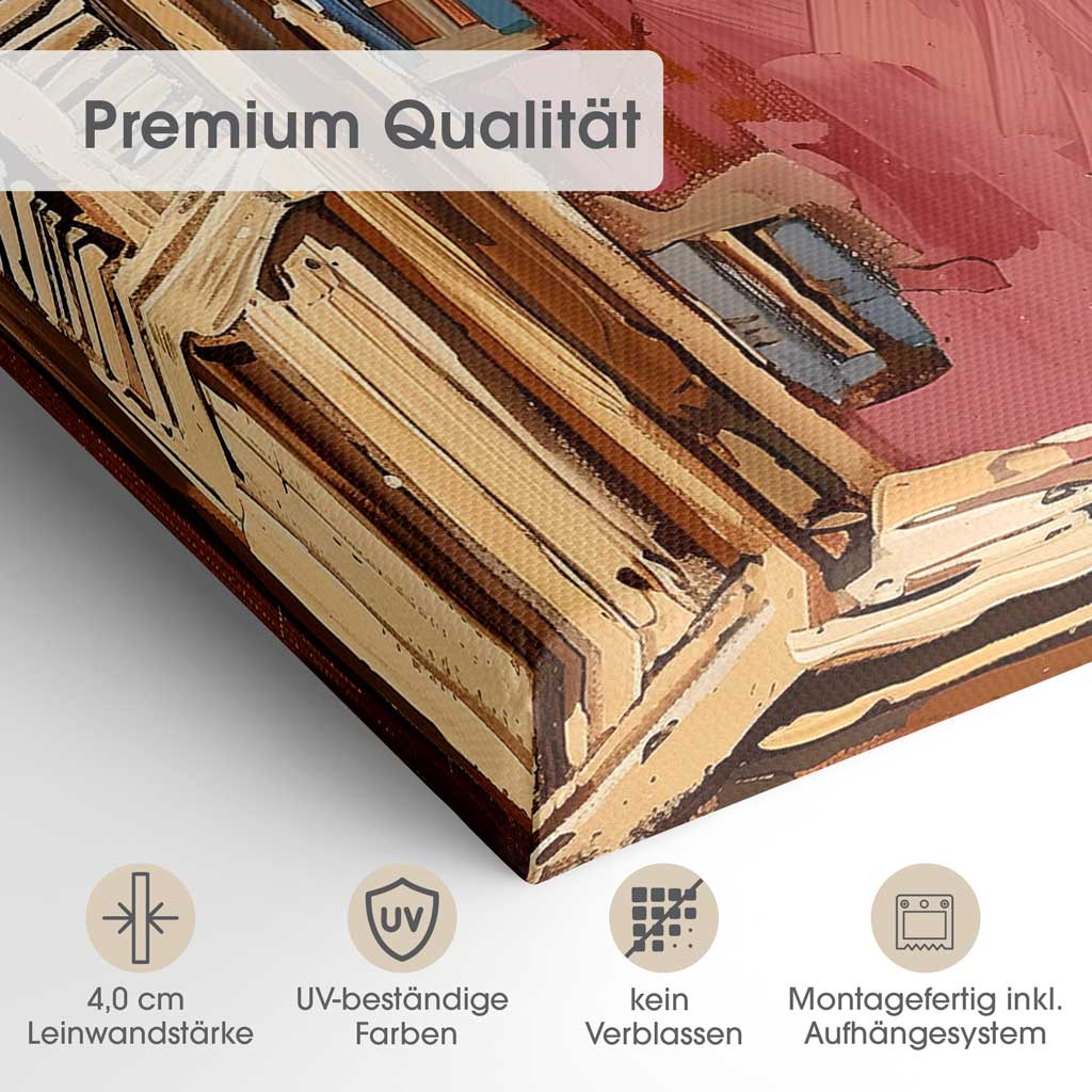 Der 4,0 cm starke Holzrahmen verleiht der Leinwand Tiefe und Stabilität. Jedes Bild wird sorgfältig aufgespannt, die Kanten sauber verarbeitet. Deine Leinwand kommt fix & fertig bei dir an – einfach auspacken, aufhängen und den neuen Look genießen.