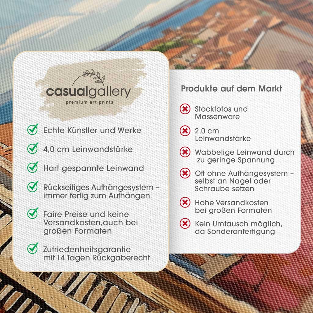 Satte Farben, gestochen scharfe Details, UV-beständig. Auf 4,0 cm starken Holzrahmen gespannt und direkt fertig zum Aufhängen geliefert.