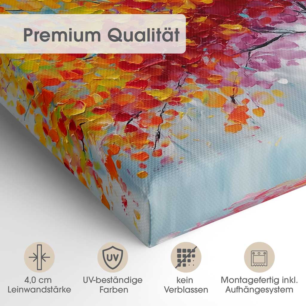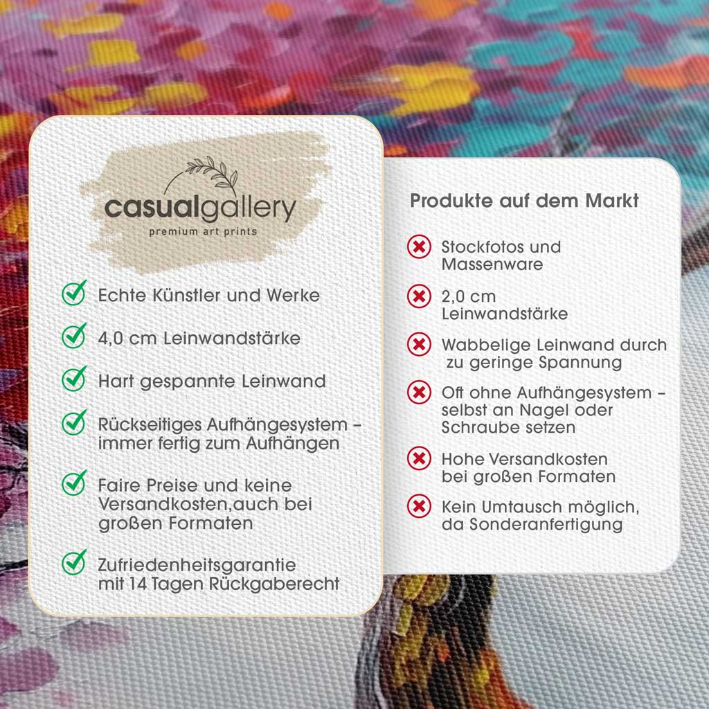 Satte Farben, gestochen scharfe Details, UV-beständig. Auf 4,0 cm starken Holzrahmen gespannt und direkt fertig zum Aufhängen geliefert.
