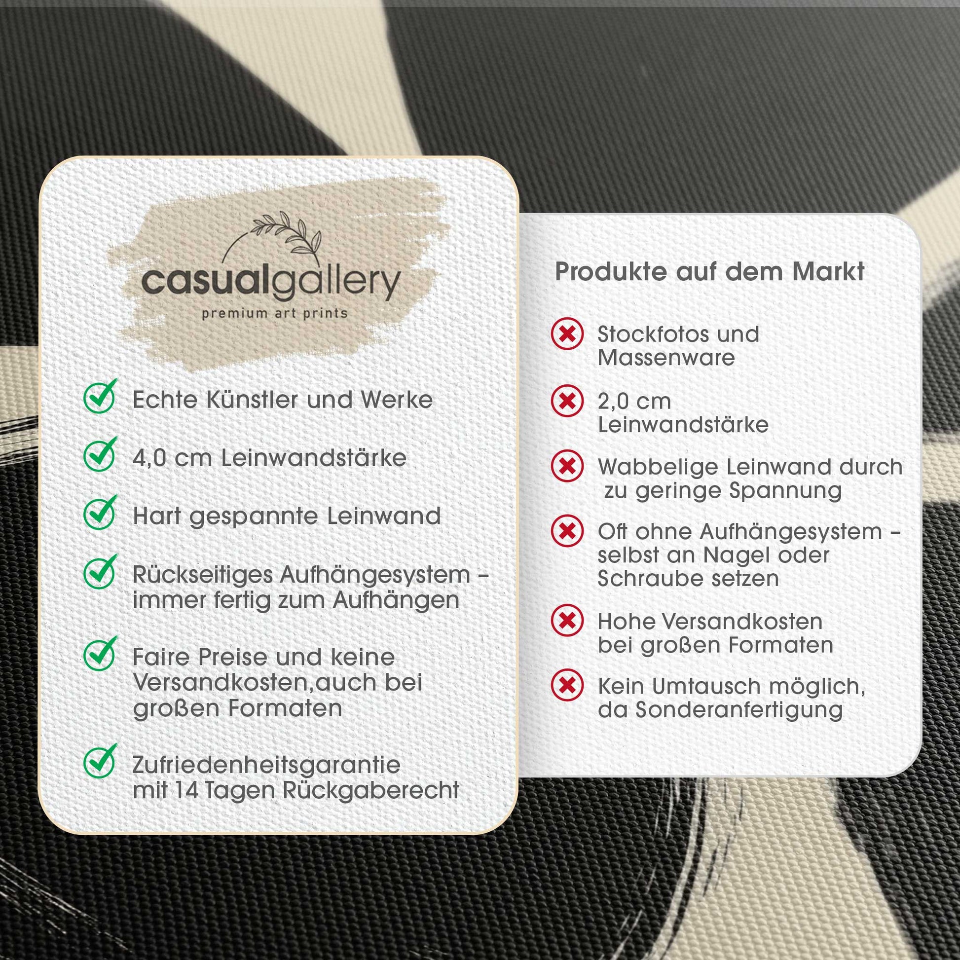 Wir hoffen, dass du mit deinem casualgallery Kunstwerk zufrieden bist. Wenn du ein anderes Produkt, eine andere Größe oder eine Rückerstattung wünscht, akzeptieren wir dennoch Umtausch und Rücksendungen innerhalb von 14 Tagen.