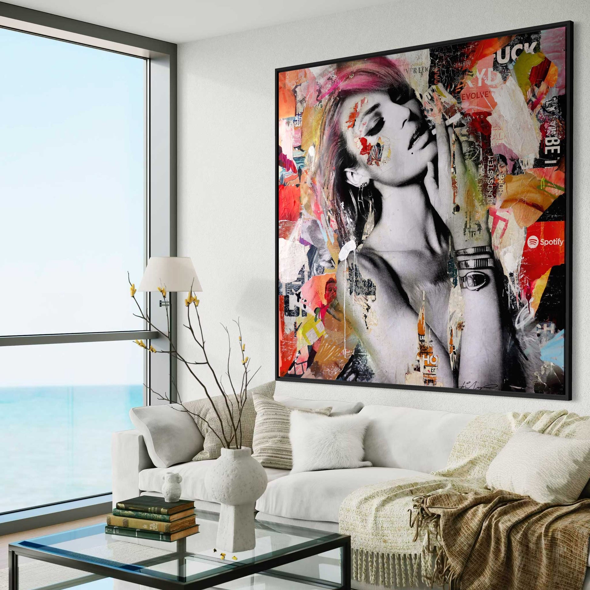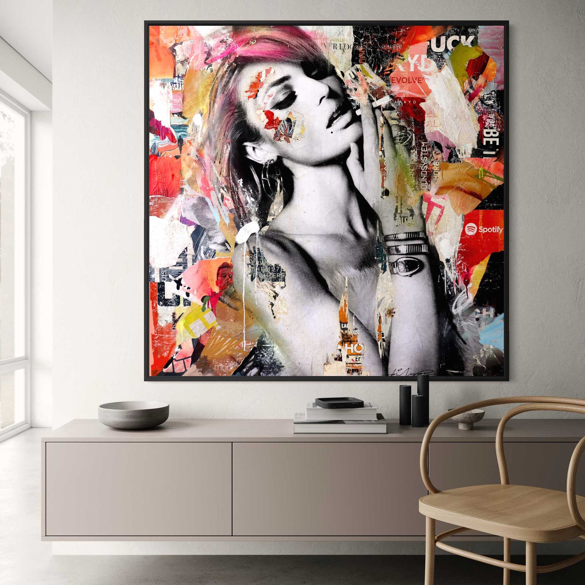 Aus handabgerissenen Plakaten, alten Werkzeugen und urbanen Fundstücken entstehen auf großen Leinwänden vielschichtige Werke mit ikonischen Persönlichkeiten wie Brigitte Bardot oder Kate Moss.