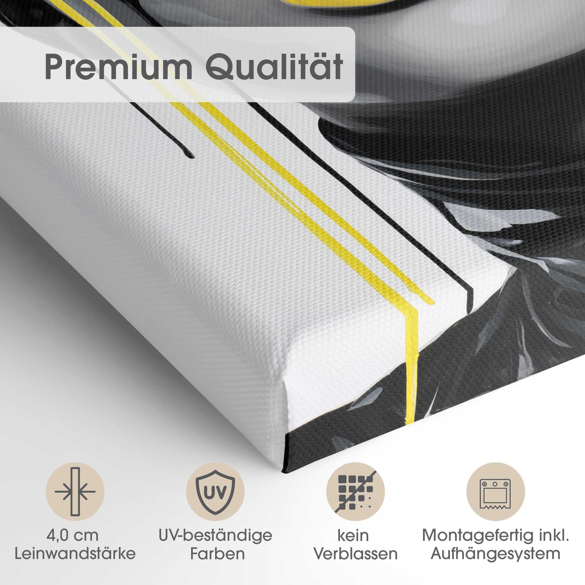 Der 4,0 cm starke Holzrahmen verleiht der Leinwand Tiefe und Stabilität. Jedes Bild wird sorgfältig aufgespannt, die Kanten sauber verarbeitet. Deine Leinwand kommt fix & fertig bei dir an – einfach auspacken, aufhängen und den neuen Look genießen.