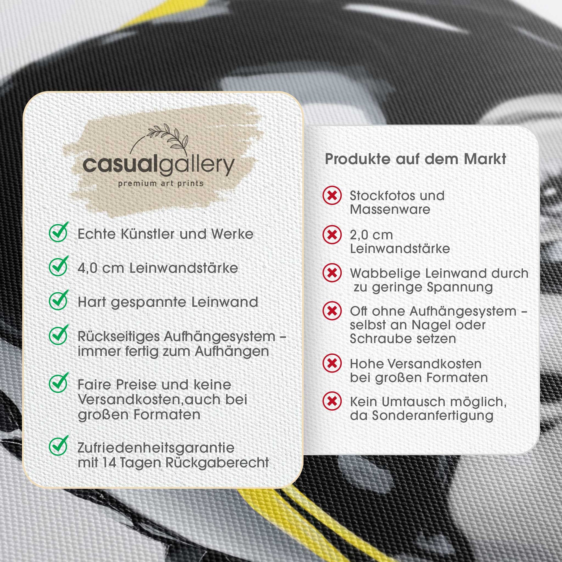 Wir hoffen, dass du mit deinem casualgallery Kunstwerk zufrieden bist. Wenn du ein anderes Produkt, eine andere Größe oder eine Rückerstattung wünscht, akzeptieren wir dennoch Umtausch und Rücksendungen innerhalb von 14 Tagen.