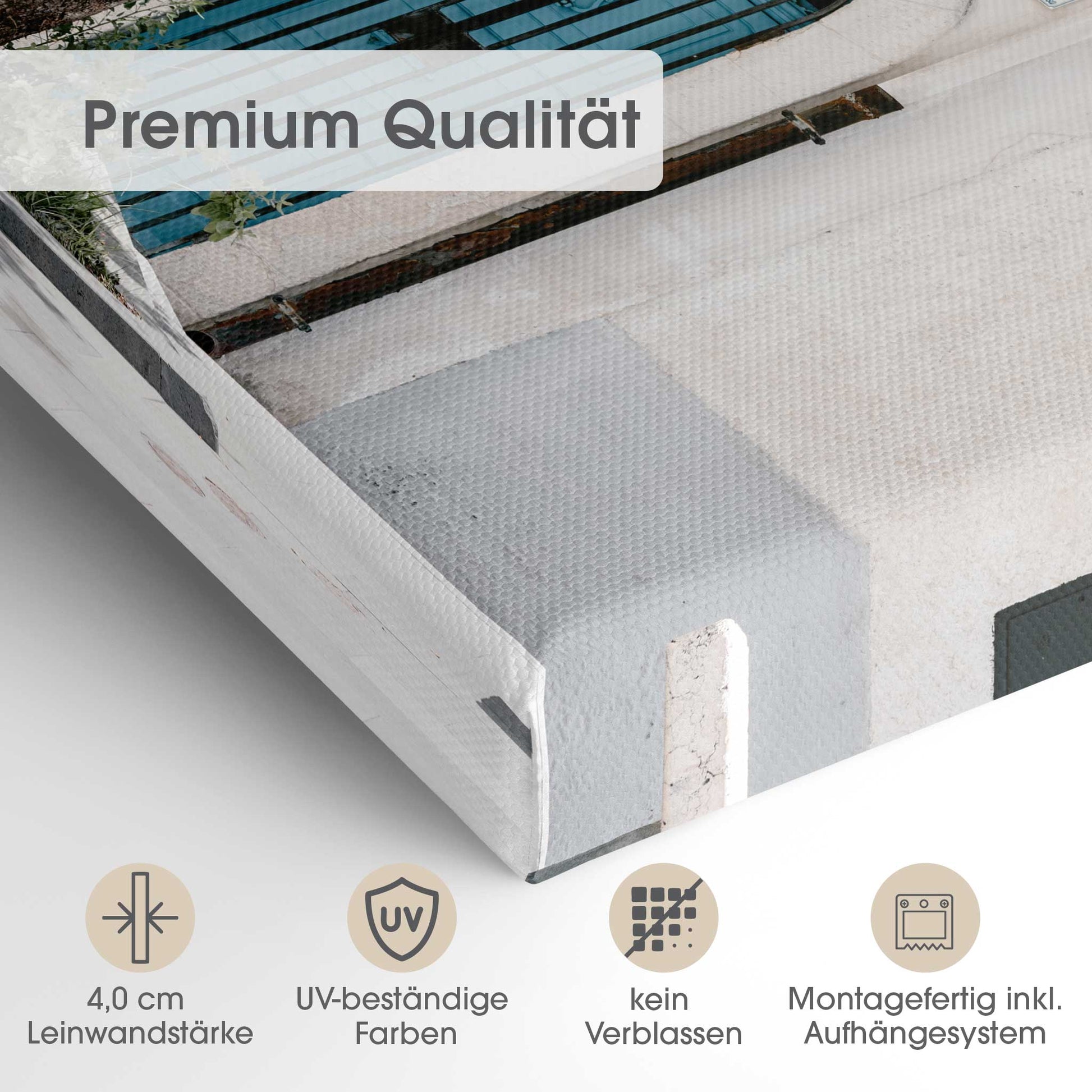 Der 4,0 cm starke Holzrahmen verleiht der Leinwand Tiefe und Stabilität. Jedes Bild wird sorgfältig aufgespannt, die Kanten sauber verarbeitet. Deine Leinwand kommt fix & fertig bei dir an – einfach auspacken, aufhängen und den neuen Look genießen.