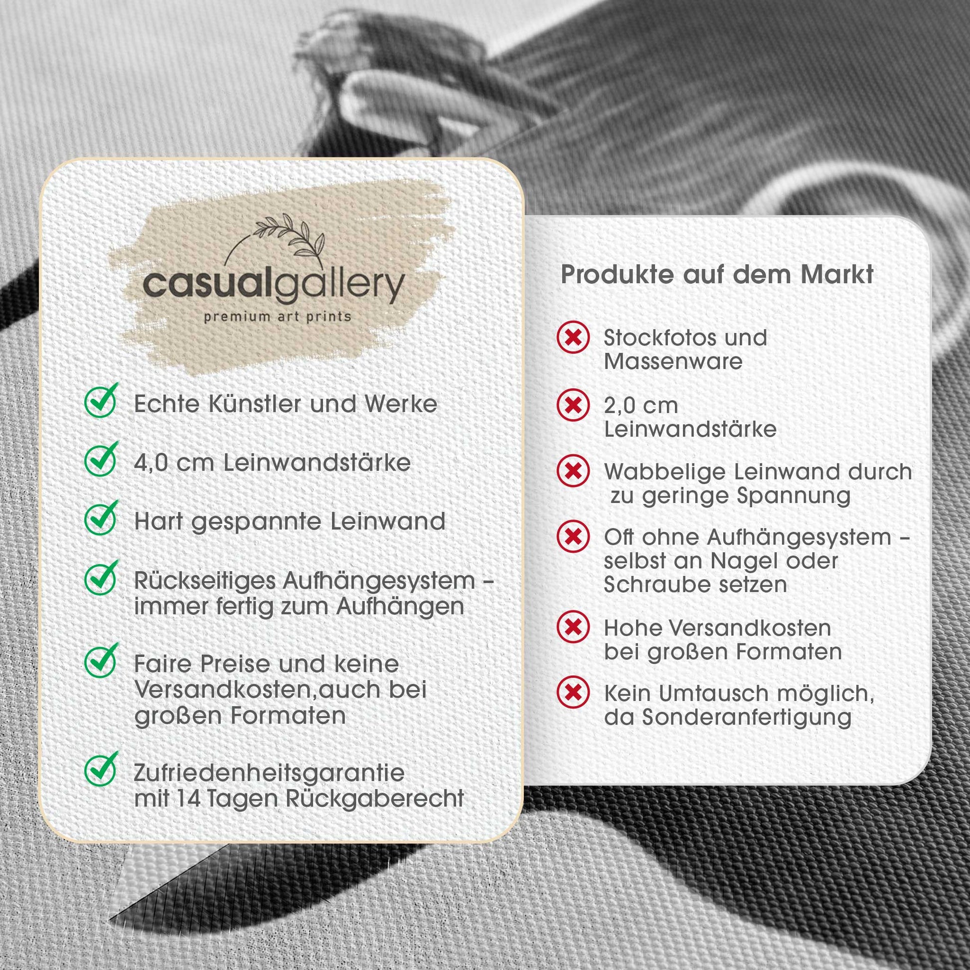 Wir hoffen, dass du mit deinem casualgallery Kunstwerk zufrieden bist. Wenn du ein anderes Produkt, eine andere Größe oder eine Rückerstattung wünscht, akzeptieren wir dennoch Umtausch und Rücksendungen innerhalb von 14 Tagen.