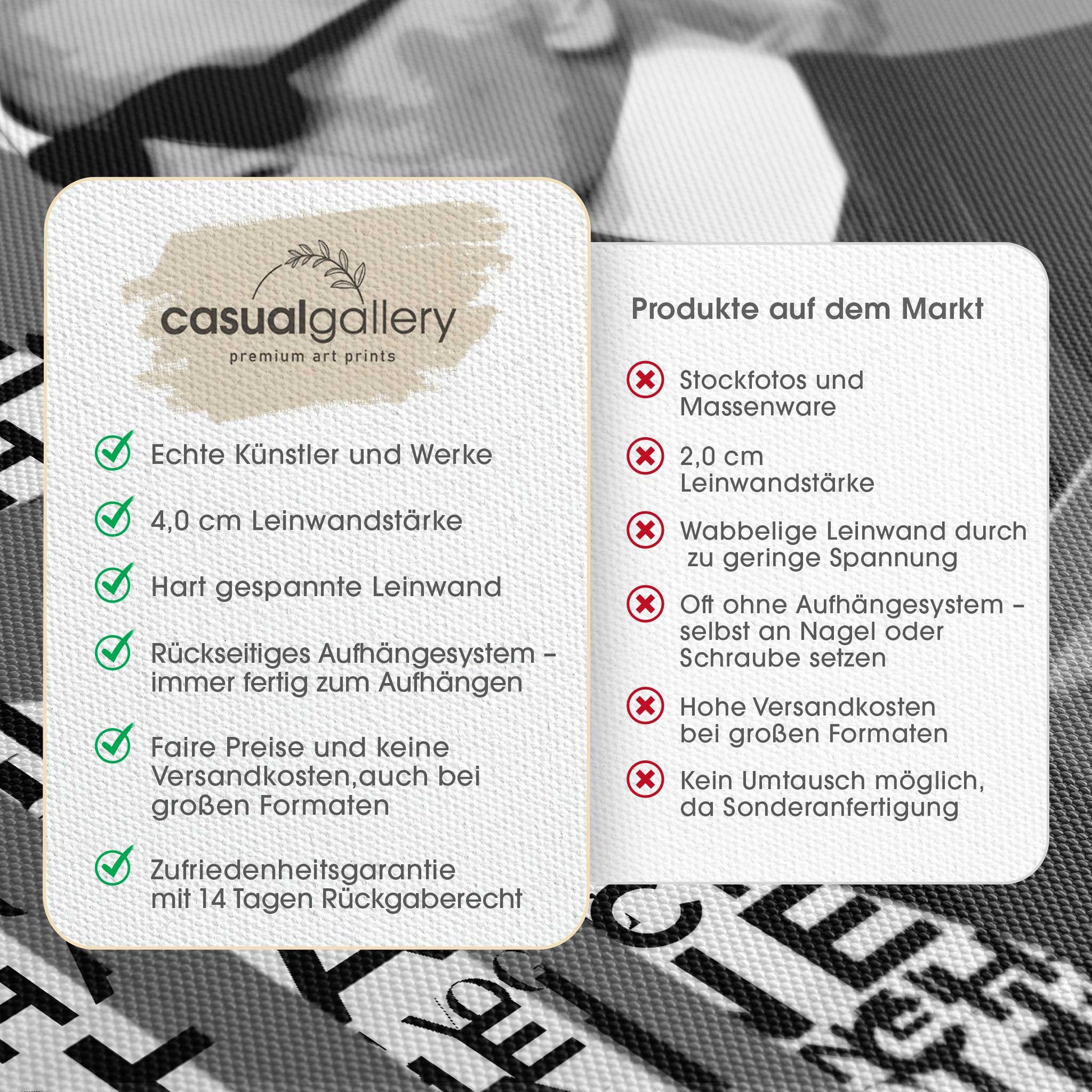 Wir hoffen, dass du mit deinem casualgallery Kunstwerk zufrieden bist. Wenn du ein anderes Produkt, eine andere Größe oder eine Rückerstattung wünscht, akzeptieren wir dennoch Umtausch und Rücksendungen innerhalb von 14 Tagen.