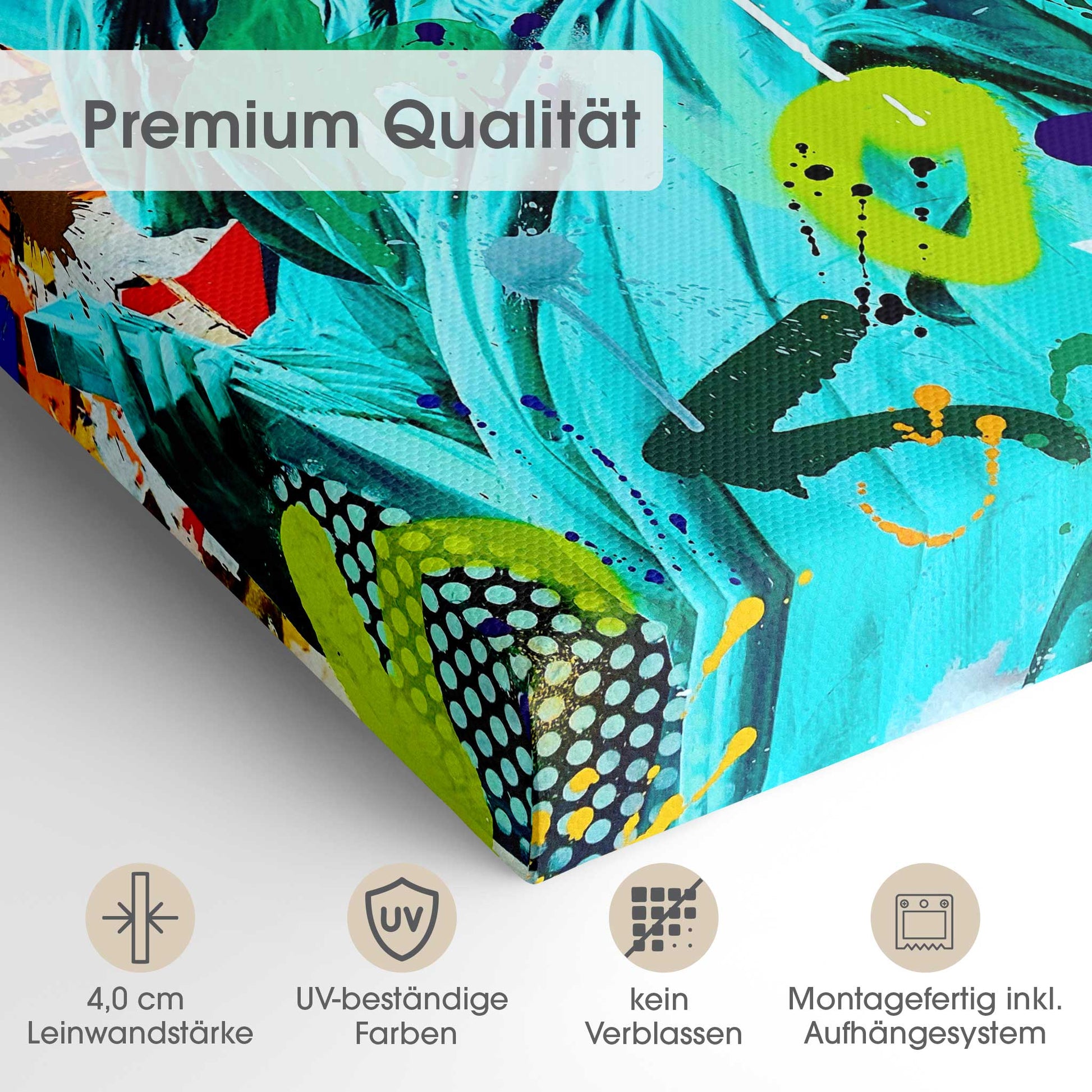 Der 4,0 cm starke Holzrahmen verleiht der Leinwand Tiefe und Stabilität. Jedes Bild wird sorgfältig aufgespannt, die Kanten sauber verarbeitet. Deine Leinwand kommt fix & fertig bei dir an – einfach auspacken, aufhängen und den neuen Look genießen.