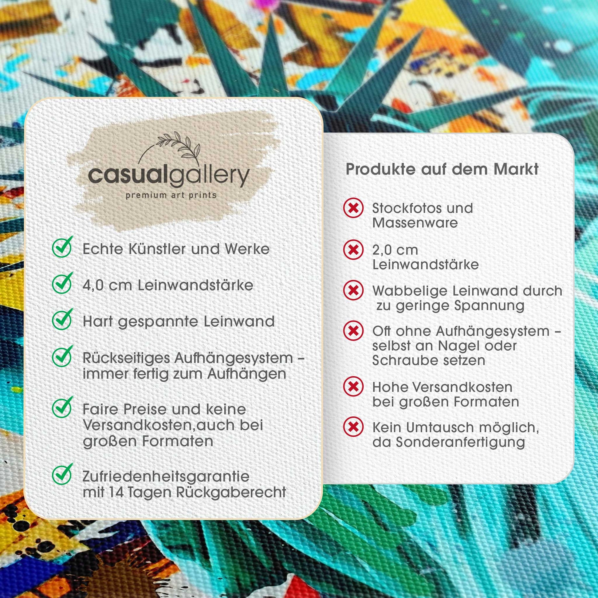 Wir hoffen, dass du mit deinem casualgallery Kunstwerk zufrieden bist. Wenn du ein anderes Produkt, eine andere Größe oder eine Rückerstattung wünscht, akzeptieren wir dennoch Umtausch und Rücksendungen innerhalb von 14 Tagen.