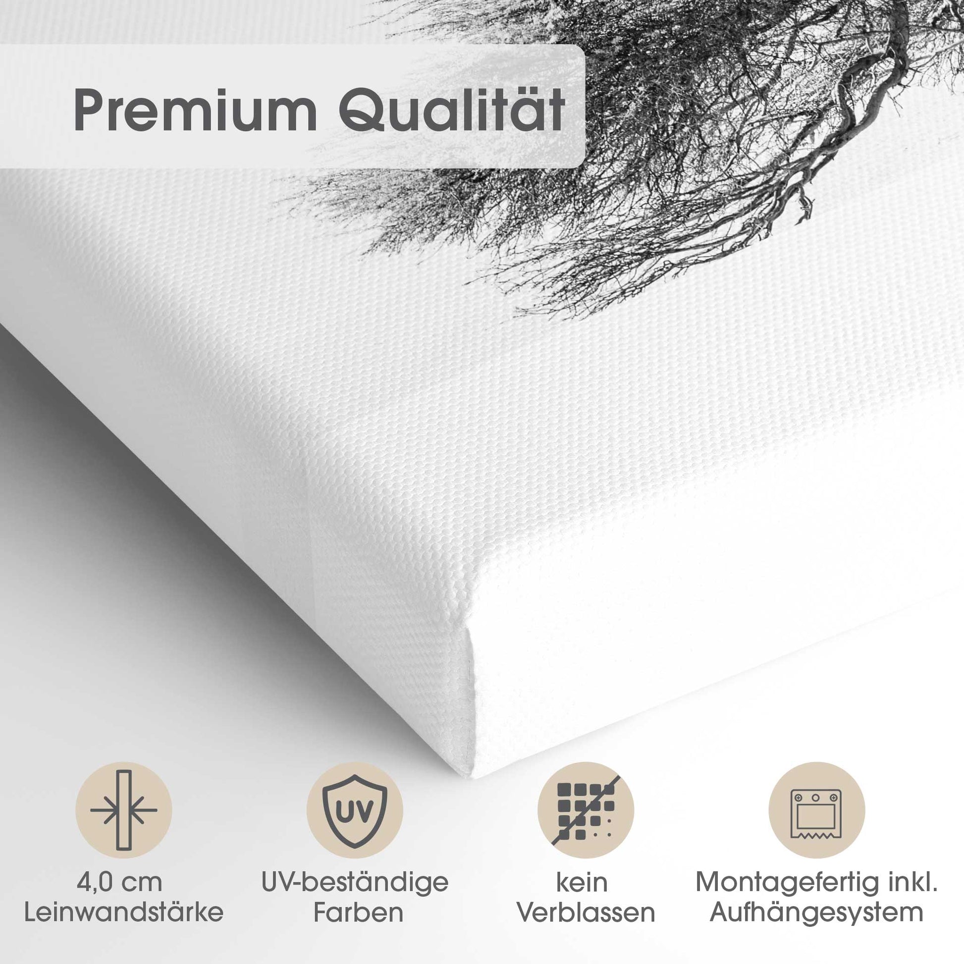 Der 4,0 cm starke Holzrahmen verleiht der Leinwand Tiefe und Stabilität. Jedes Bild wird sorgfältig aufgespannt, die Kanten sauber verarbeitet. Deine Leinwand kommt fix & fertig bei dir an – einfach auspacken, aufhängen und den neuen Look genießen.