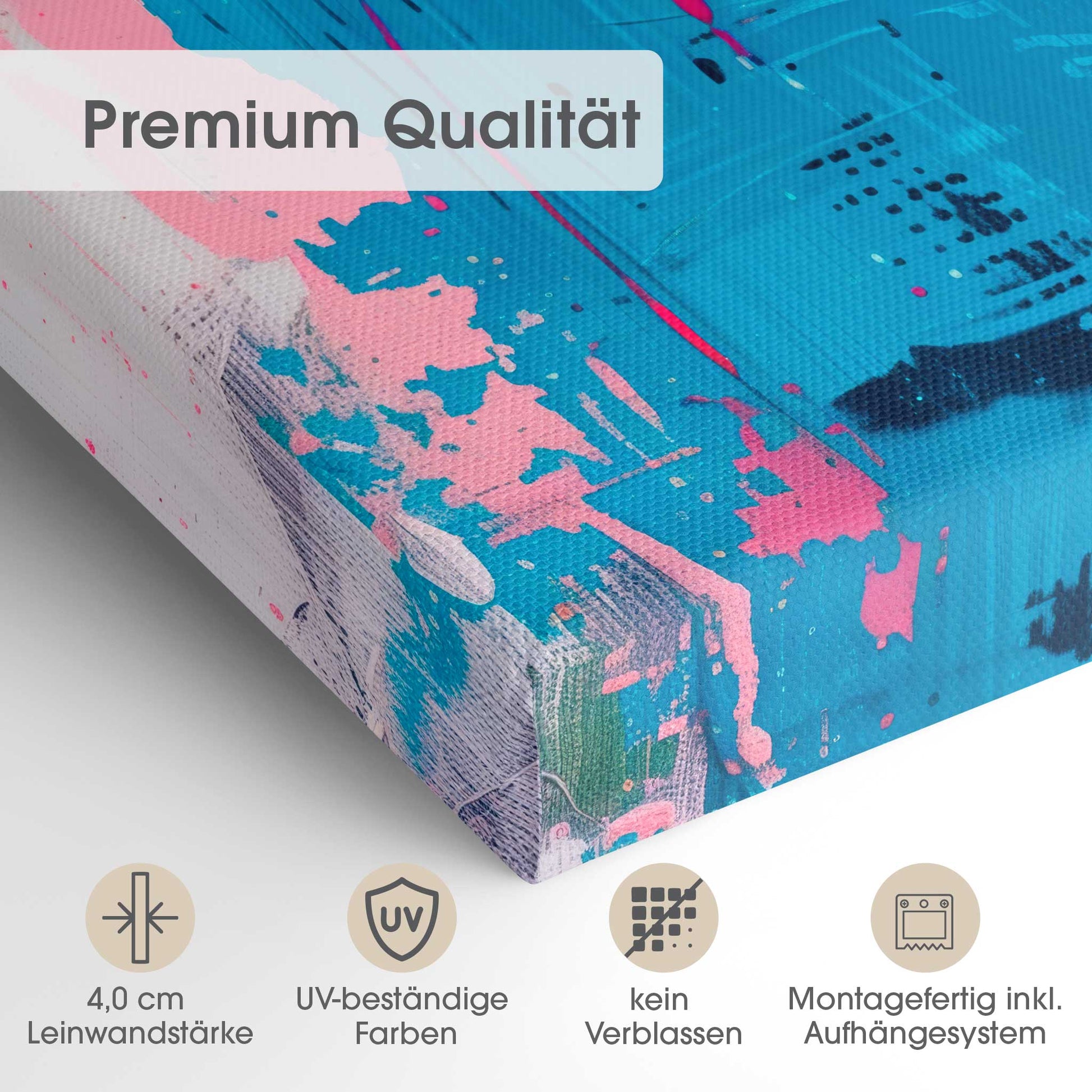 Der 4,0 cm starke Holzrahmen verleiht der Leinwand Tiefe und Stabilität. Jedes Bild wird sorgfältig aufgespannt, die Kanten sauber verarbeitet. Deine Leinwand kommt fix & fertig bei dir an – einfach auspacken, aufhängen und den neuen Look genießen.
