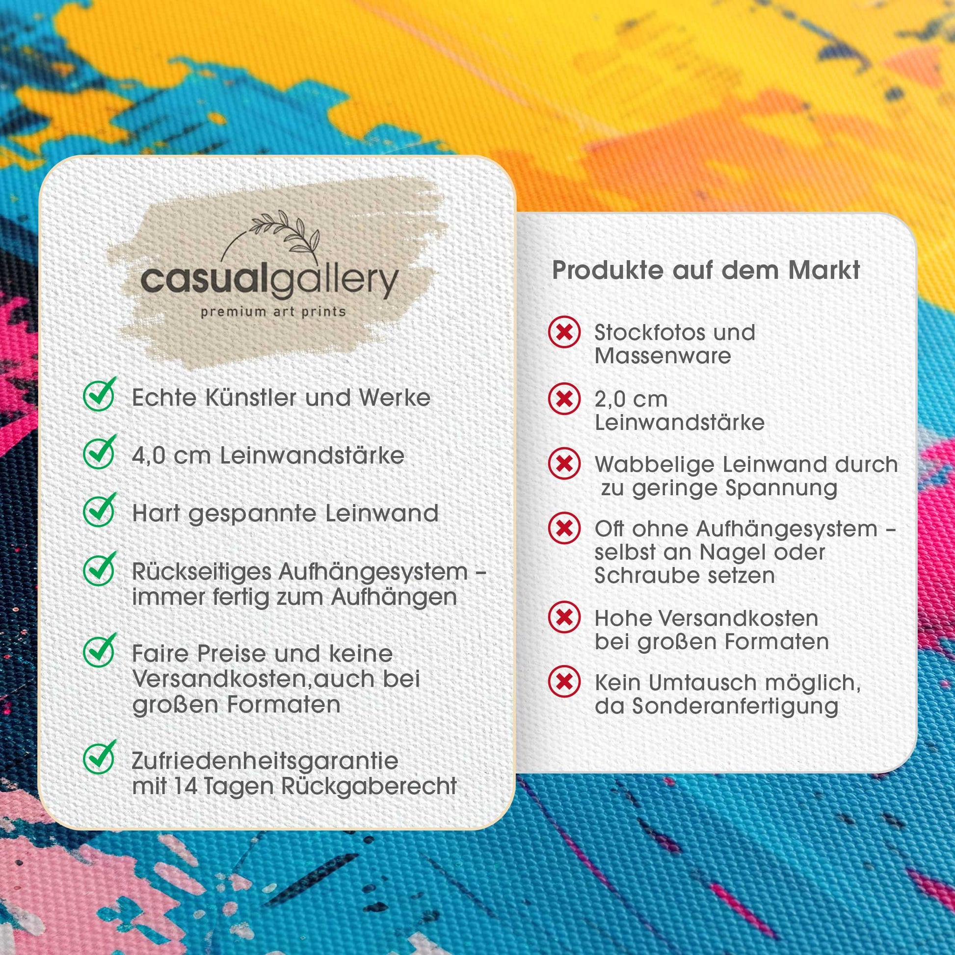 Wir hoffen, dass du mit deinem casualgallery Kunstwerk zufrieden bist. Wenn du ein anderes Produkt, eine andere Größe oder eine Rückerstattung wünscht, akzeptieren wir dennoch Umtausch und Rücksendungen innerhalb von 14 Tagen.