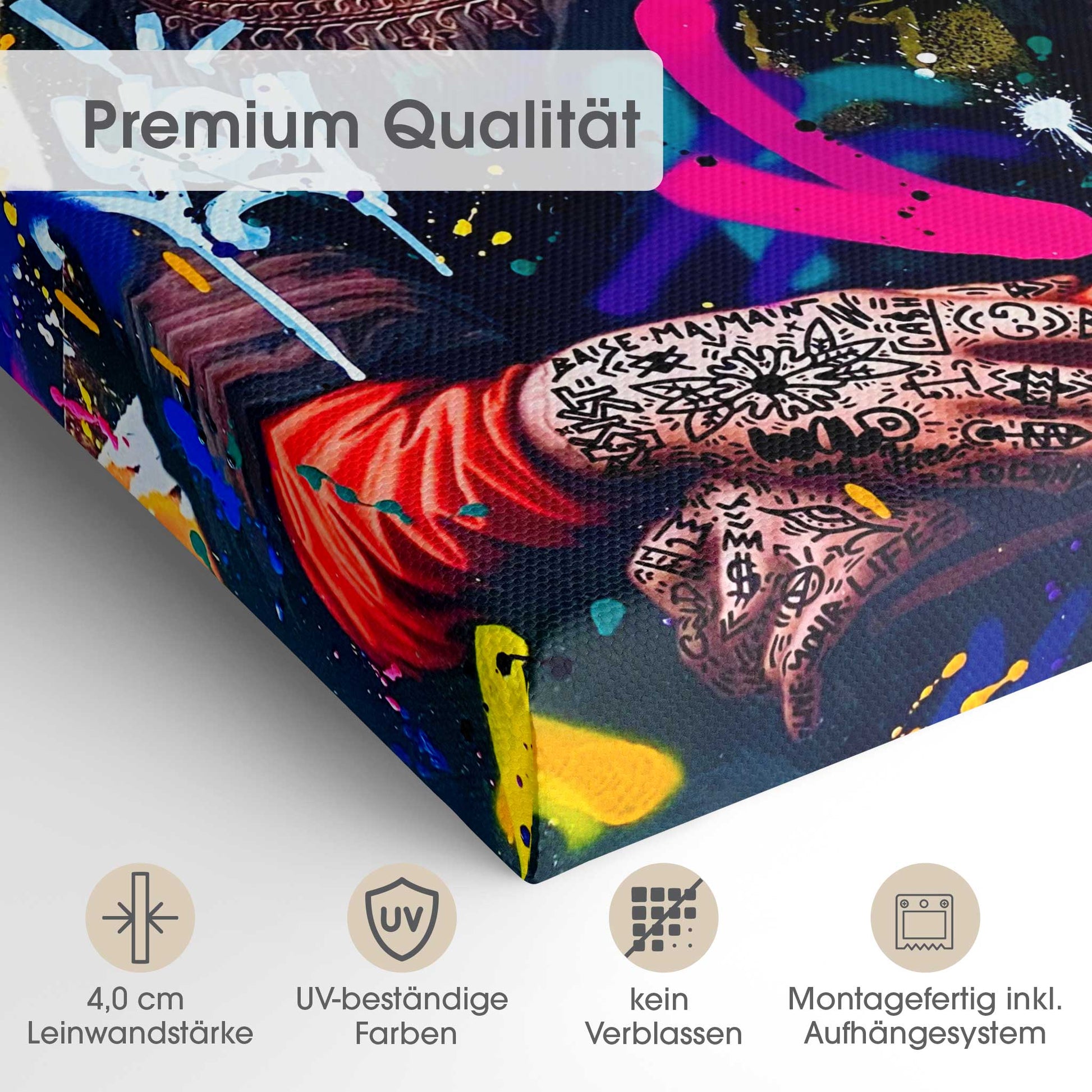 Der 4,0 cm starke Holzrahmen verleiht der Leinwand Tiefe und Stabilität. Jedes Bild wird sorgfältig aufgespannt, die Kanten sauber verarbeitet. Deine Leinwand kommt fix & fertig bei dir an – einfach auspacken, aufhängen und den neuen Look genießen.