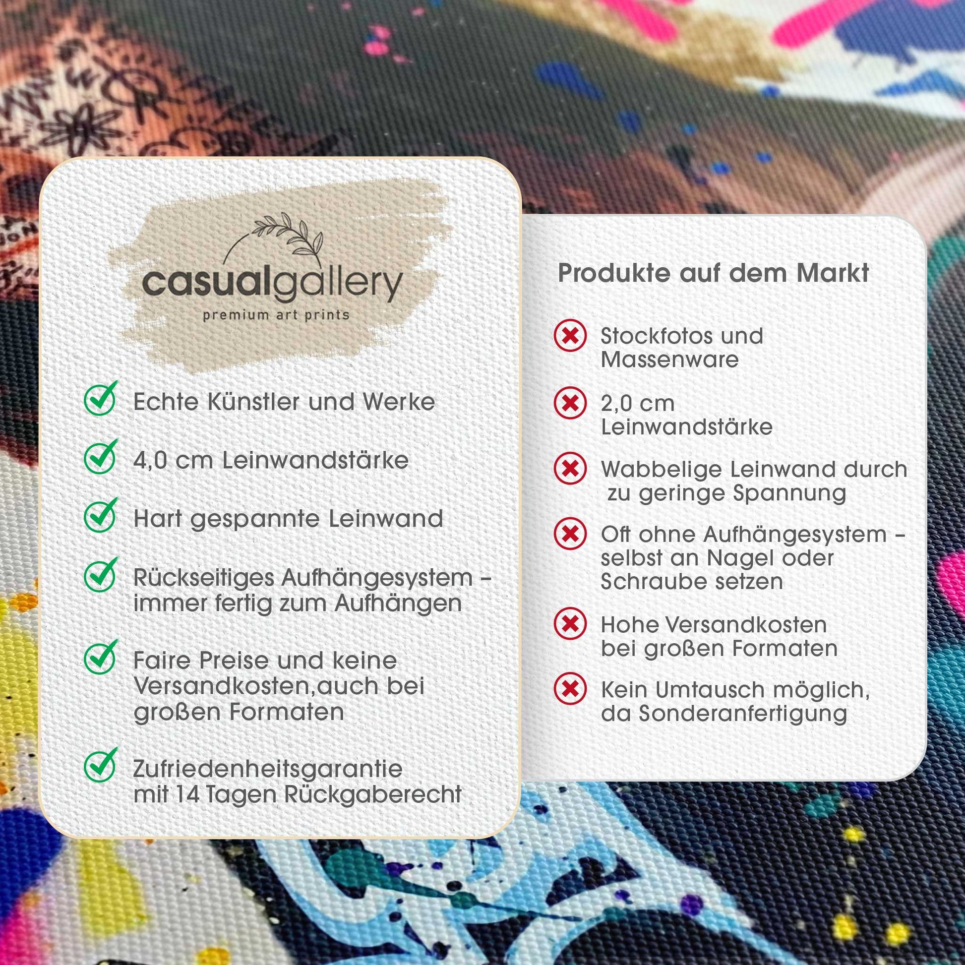 Wir hoffen, dass du mit deinem casualgallery Kunstwerk zufrieden bist. Wenn du ein anderes Produkt, eine andere Größe oder eine Rückerstattung wünscht, akzeptieren wir dennoch Umtausch und Rücksendungen innerhalb von 14 Tagen.