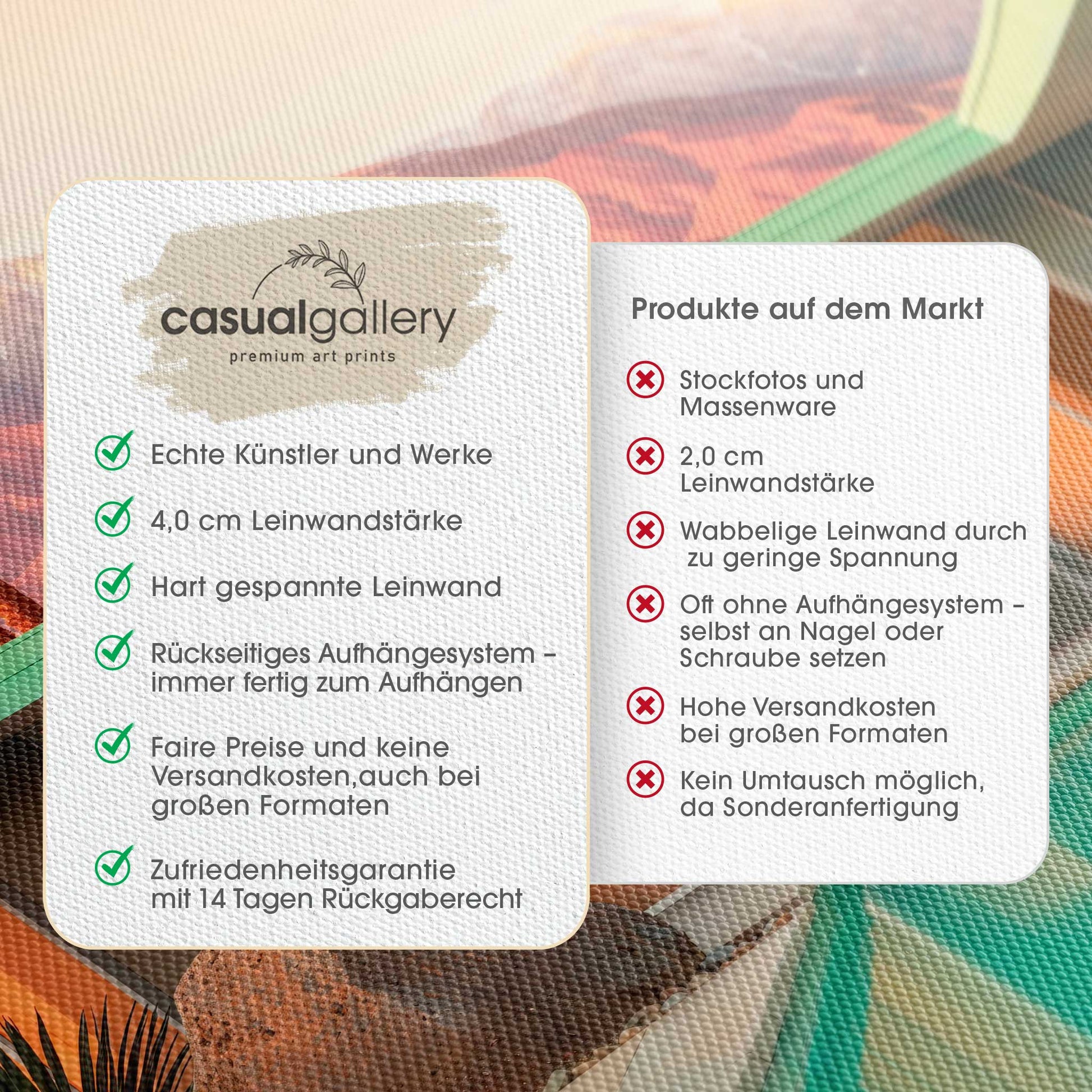 Satte Farben, gestochen scharfe Details, UV-beständig. Auf 4,0 cm starken Holzrahmen gespannt und direkt fertig zum Aufhängen geliefert.