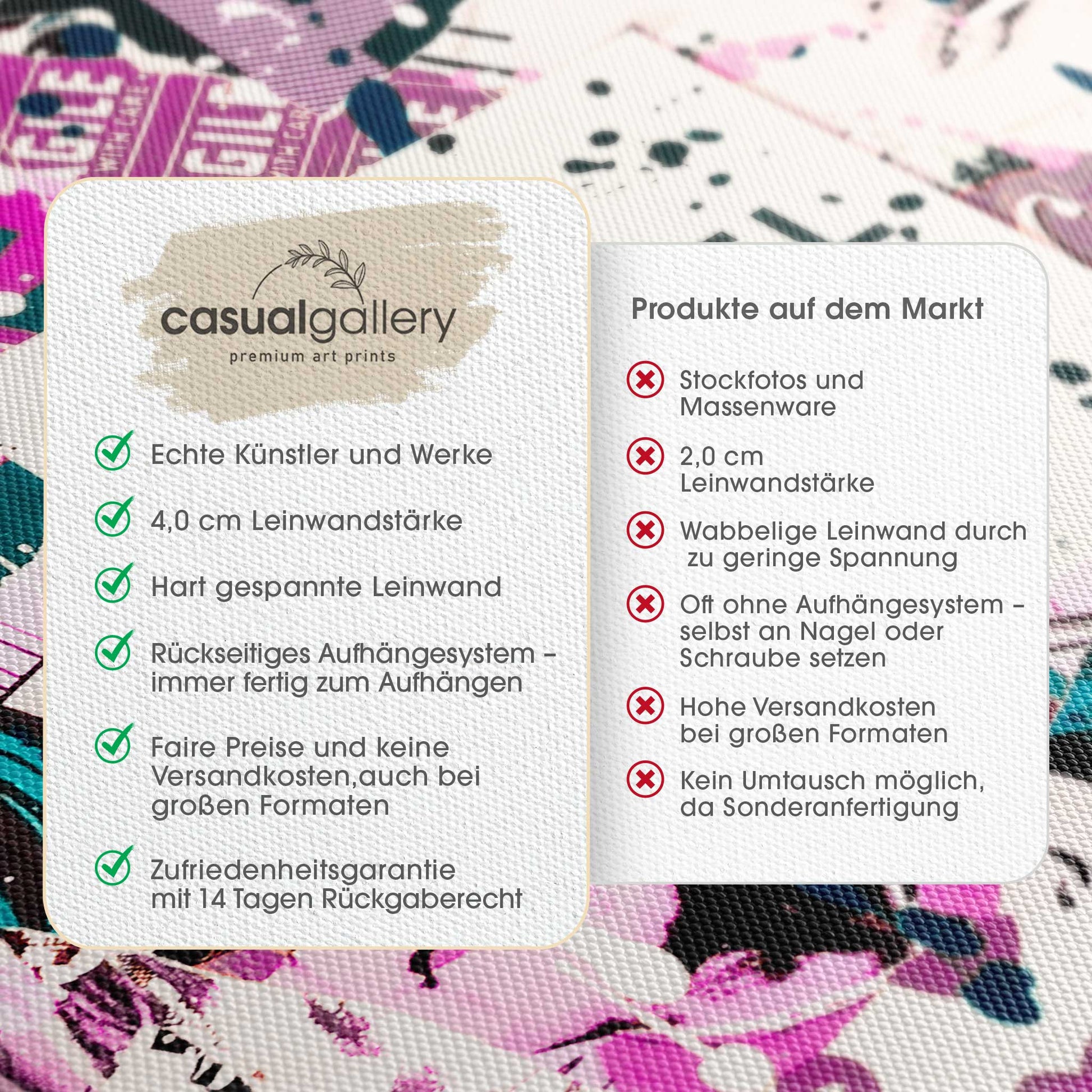 Wir hoffen, dass du mit deinem casualgallery Kunstwerk zufrieden bist. Wenn du ein anderes Produkt, eine andere Größe oder eine Rückerstattung wünscht, akzeptieren wir dennoch Umtausch und Rücksendungen innerhalb von 14 Tagen.