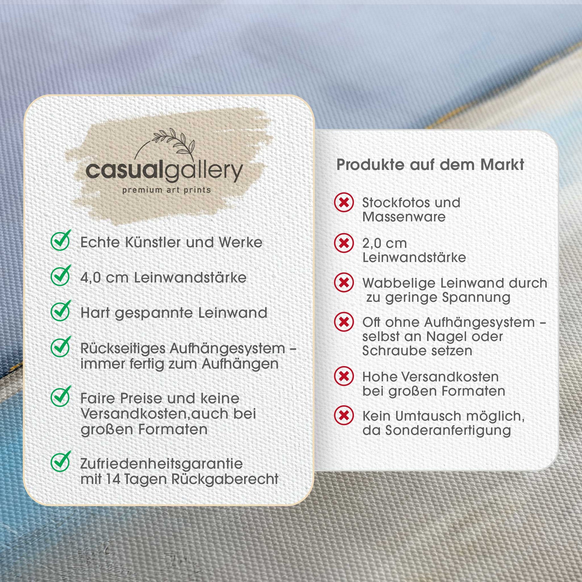 Wir hoffen, dass du mit deinem casualgallery Kunstwerk zufrieden bist. Wenn du ein anderes Produkt, eine andere Größe oder eine Rückerstattung wünscht, akzeptieren wir dennoch Umtausch und Rücksendungen innerhalb von 14 Tagen.