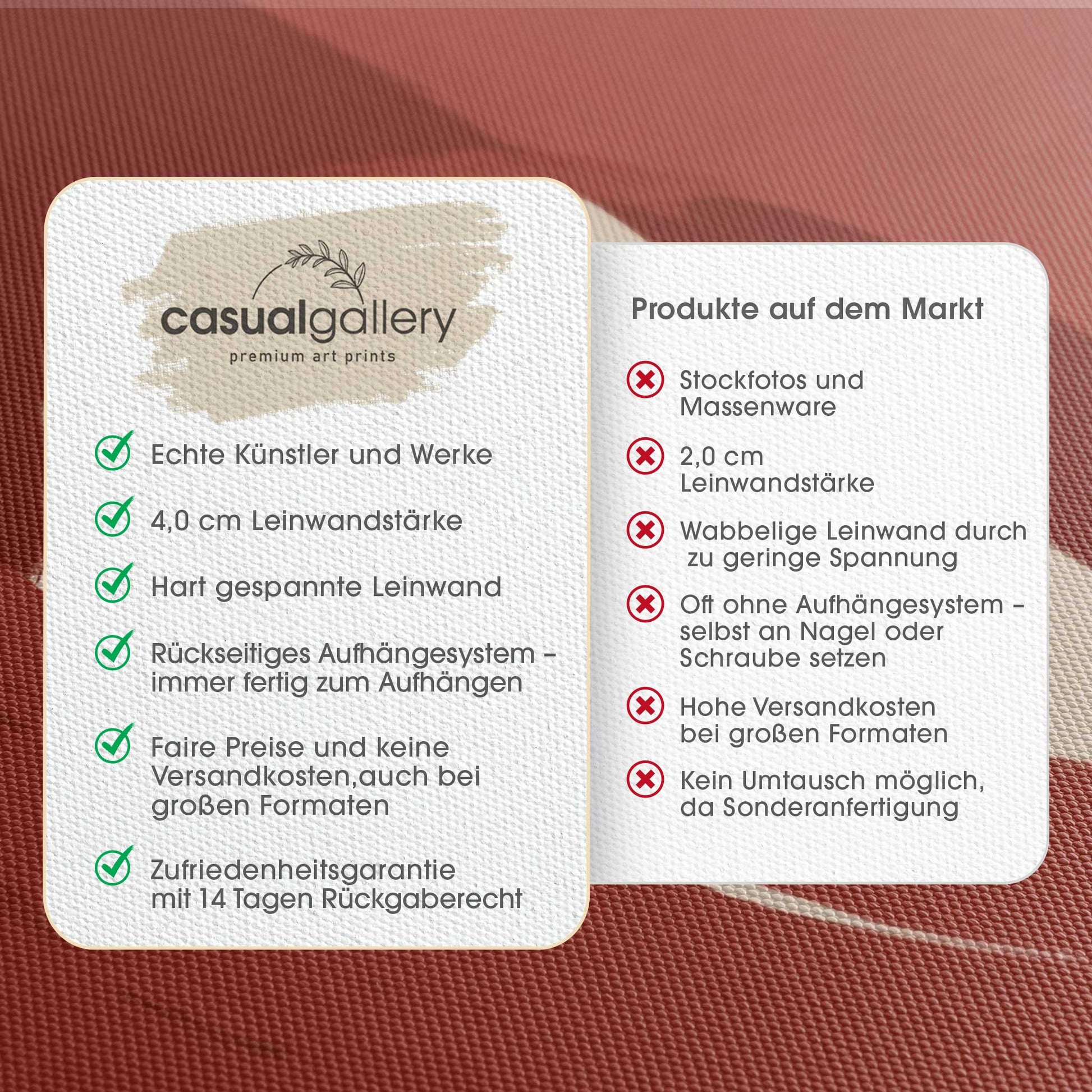 Wir hoffen, dass du mit deinem casualgallery Kunstwerk zufrieden bist. Wenn du ein anderes Produkt, eine andere Größe oder eine Rückerstattung wünscht, akzeptieren wir dennoch Umtausch und Rücksendungen innerhalb von 14 Tagen.