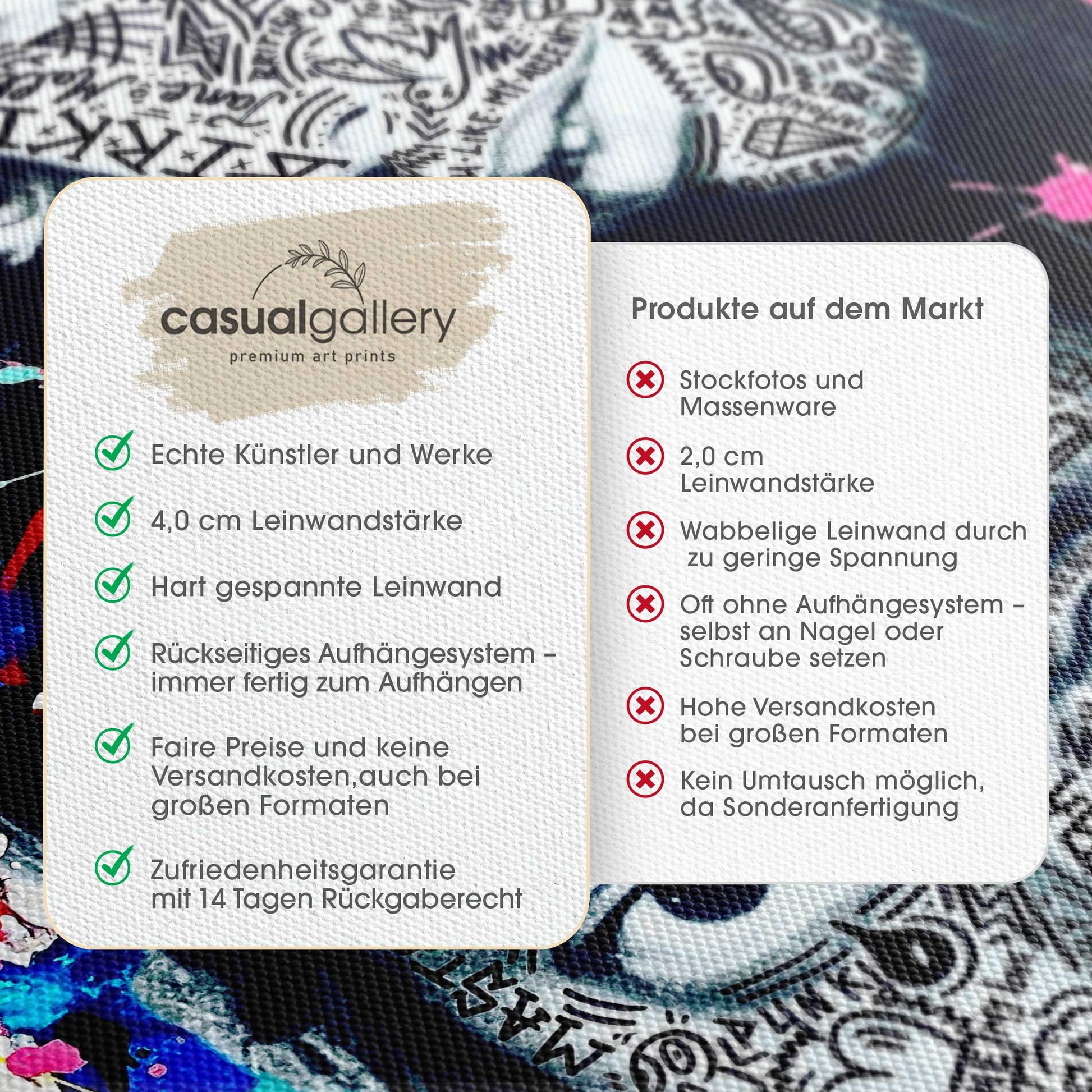 Wir hoffen, dass du mit deinem casualgallery Kunstwerk zufrieden bist. Wenn du ein anderes Produkt, eine andere Größe oder eine Rückerstattung wünscht, akzeptieren wir dennoch Umtausch und Rücksendungen innerhalb von 14 Tagen.