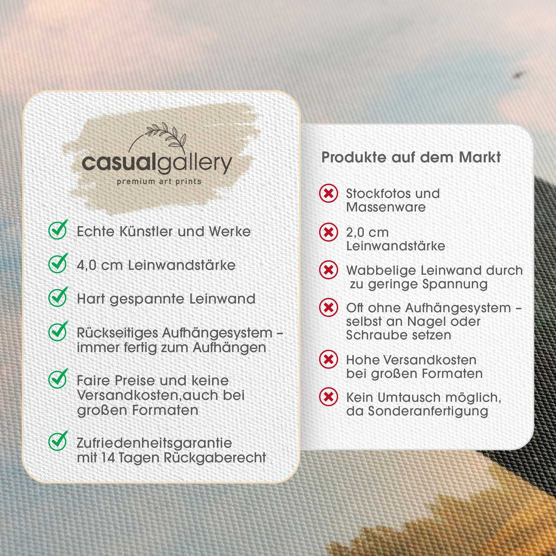 Wir hoffen, dass du mit deinem casualgallery Kunstwerk zufrieden bist. Wenn du ein anderes Produkt, eine andere Größe oder eine Rückerstattung wünscht, akzeptieren wir dennoch Umtausch und Rücksendungen innerhalb von 14 Tagen.