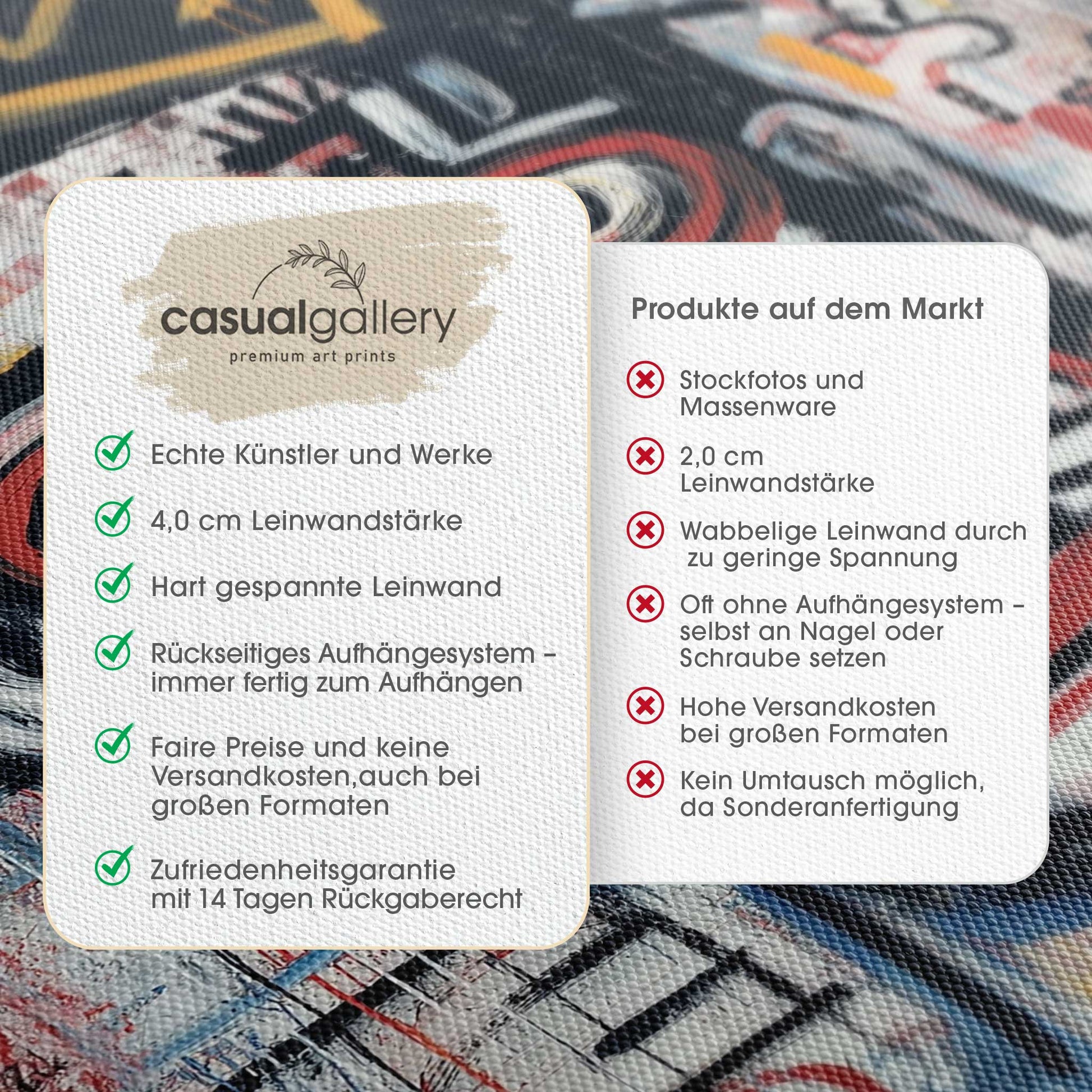 Wir hoffen, dass du mit deinem casualgallery Kunstwerk zufrieden bist. Wenn du ein anderes Produkt, eine andere Größe oder eine Rückerstattung wünscht, akzeptieren wir dennoch Umtausch und Rücksendungen innerhalb von 14 Tagen.