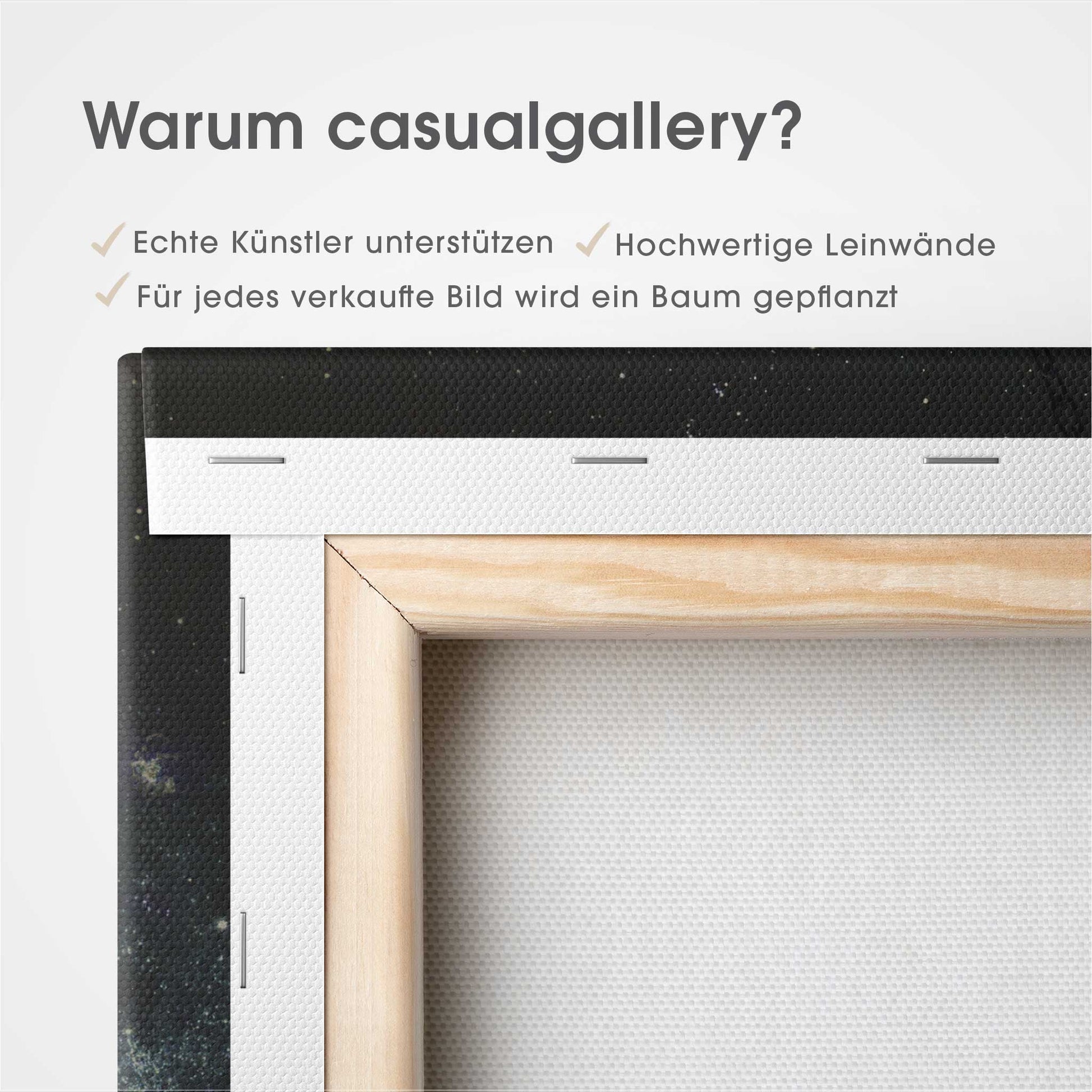 Der 4,0 cm starke Holzrahmen verleiht der Leinwand Tiefe und Stabilität. Jedes Bild wird sorgfältig aufgespannt, die Kanten sauber verarbeitet. Deine Leinwand kommt fix & fertig bei dir an – einfach auspacken, aufhängen und den neuen Look genießen.