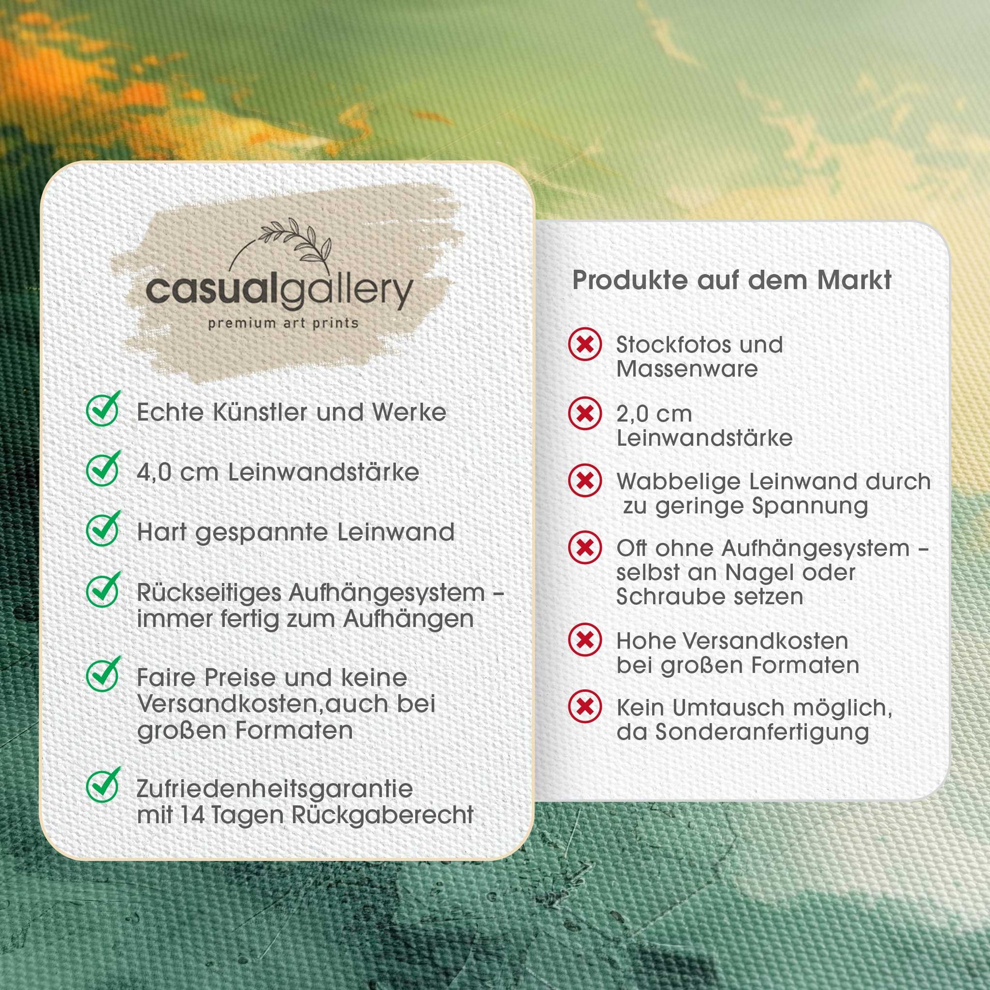 Satte Farben, gestochen scharfe Details, UV-beständig. Auf 4,0 cm starken Holzrahmen gespannt und direkt fertig zum Aufhängen geliefert.