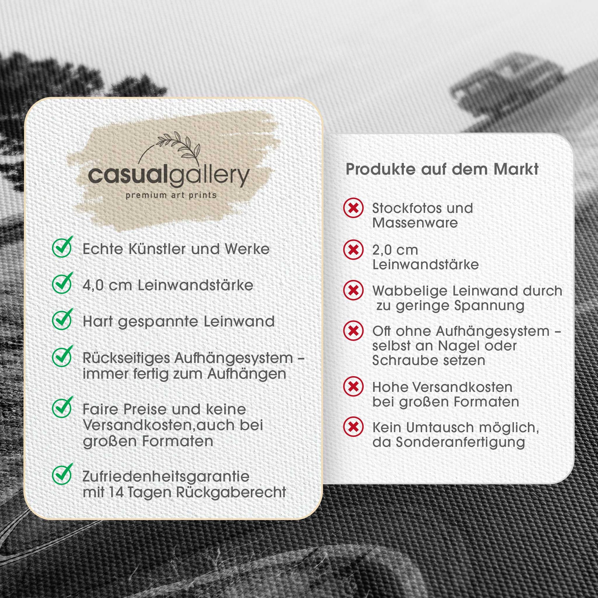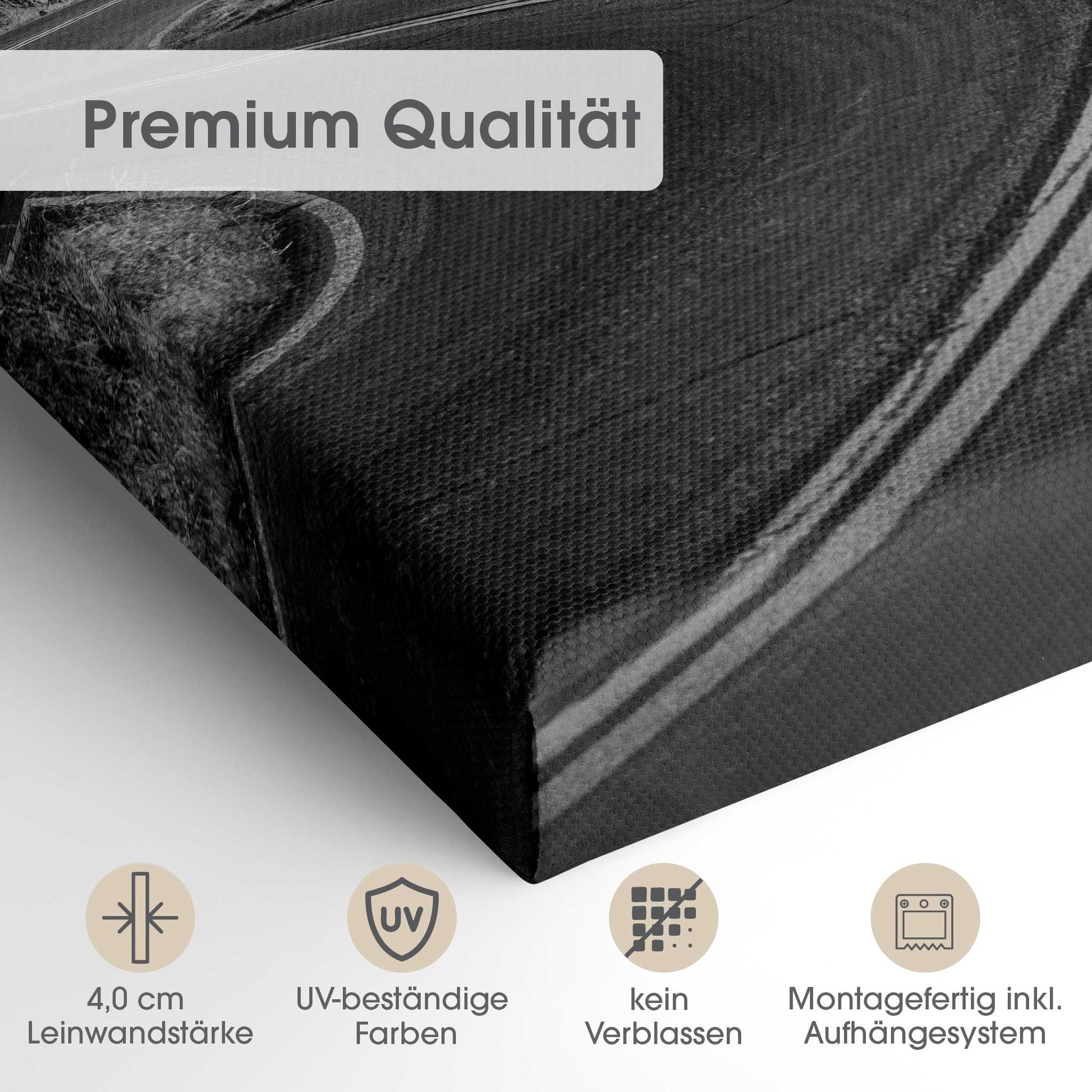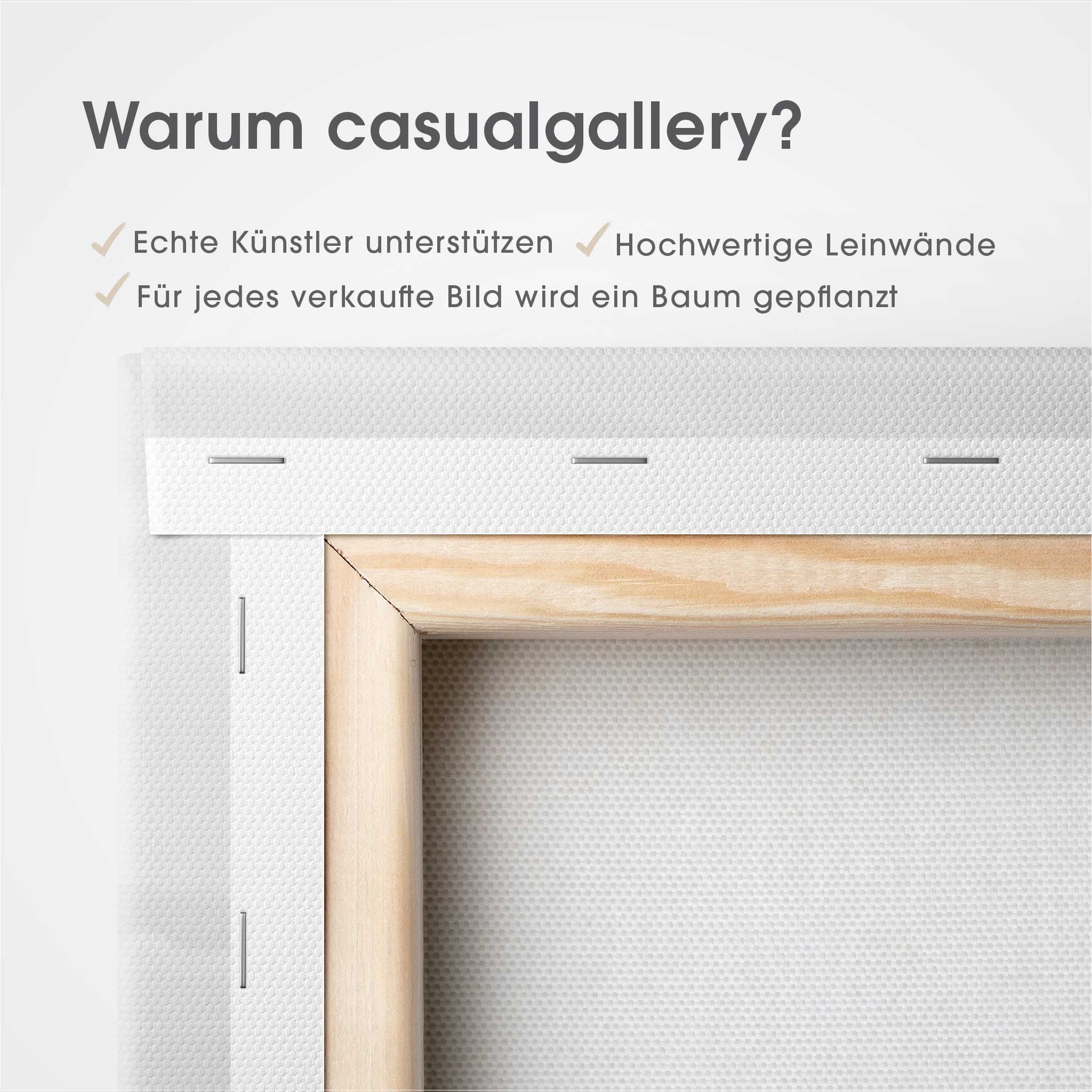 Der 4,0 cm starke Holzrahmen verleiht der Leinwand Tiefe und Stabilität. Jedes Bild wird sorgfältig aufgespannt, die Kanten sauber verarbeitet. Deine Leinwand kommt fix & fertig bei dir an – einfach auspacken, aufhängen und den neuen Look genießen.